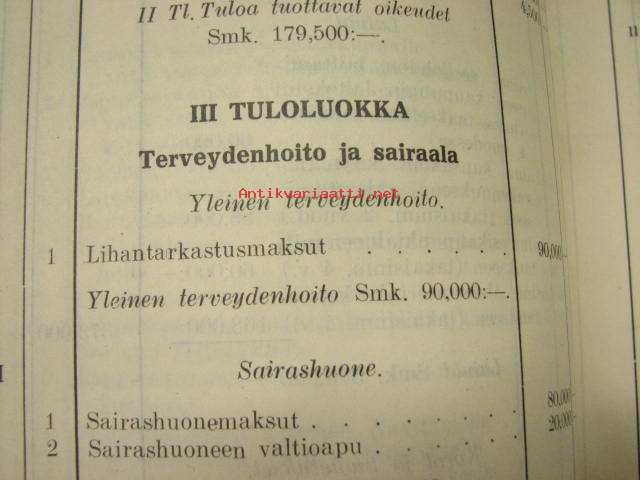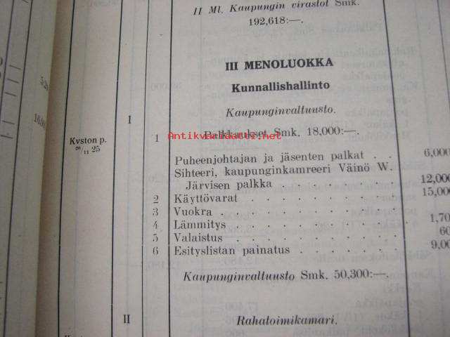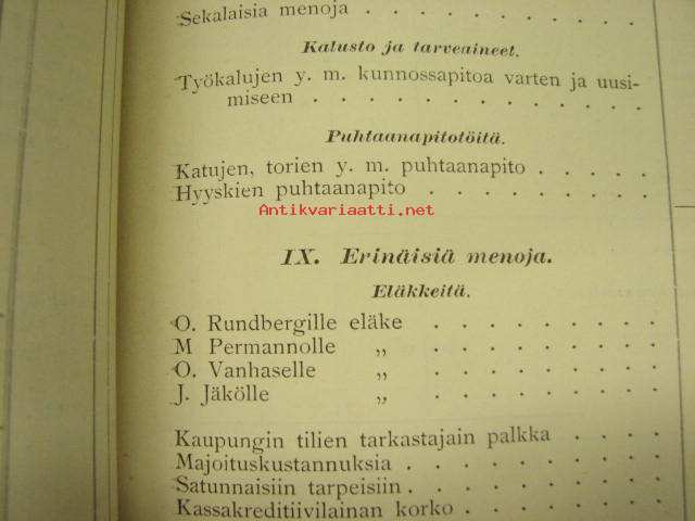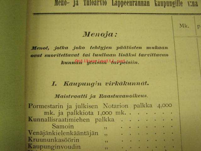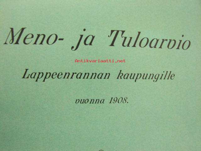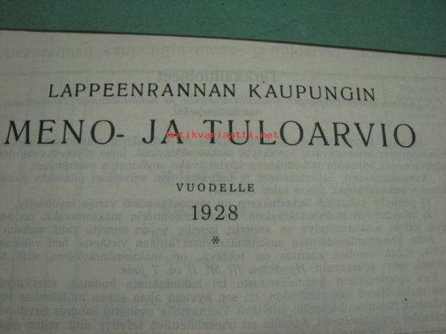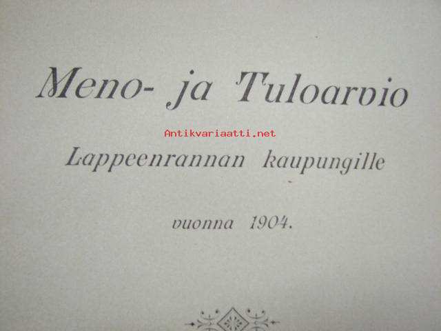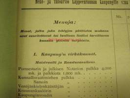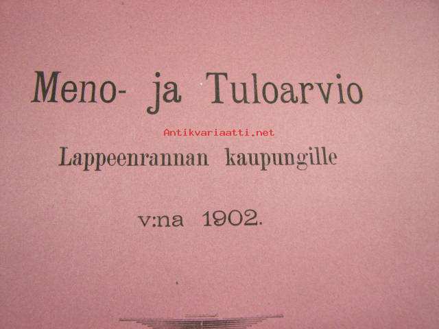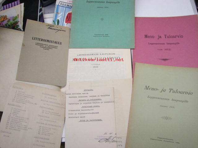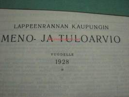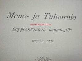 Meno- ja tuloarvio Lappeenrannan kaupunki, erilliset painokset vuuosille 1902, 1904, 1908, 1928 ym. asiakirjoja budjetoinnista