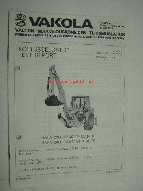 Haka 2000 Traktorikaivuri Vakola koetusselostus nr 978 1978