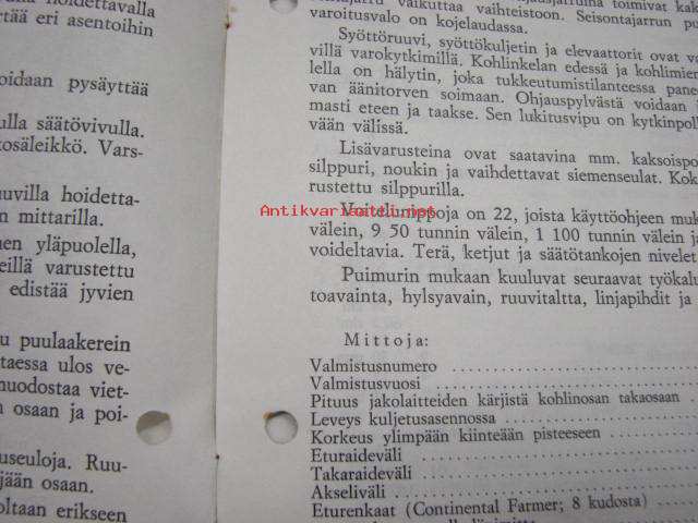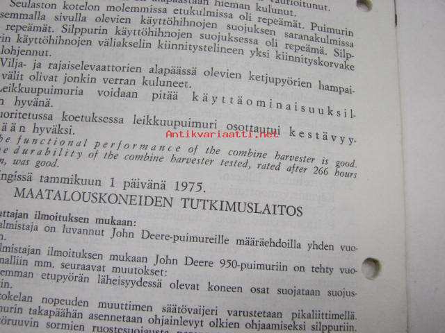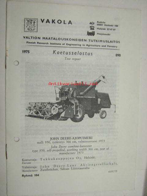 John Deere ajopuimuri Vakola koetusselostus nr 890 1975
