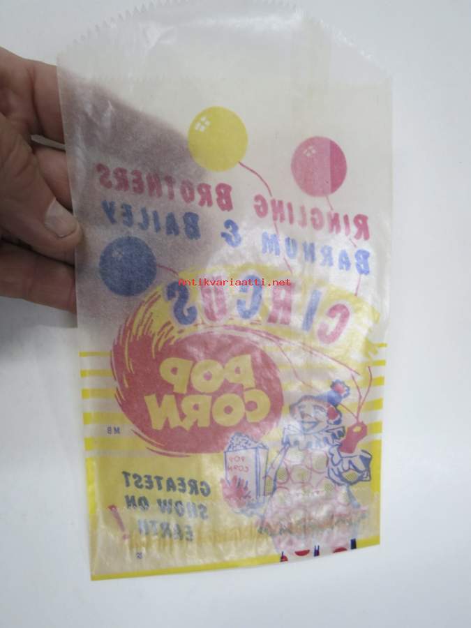 Ringling Brothers - Barnum & Bailey - Circus Pop Corn -sirkusareenalla myytyjen popkornien käyttämätön pussi 1940-luvulta