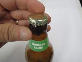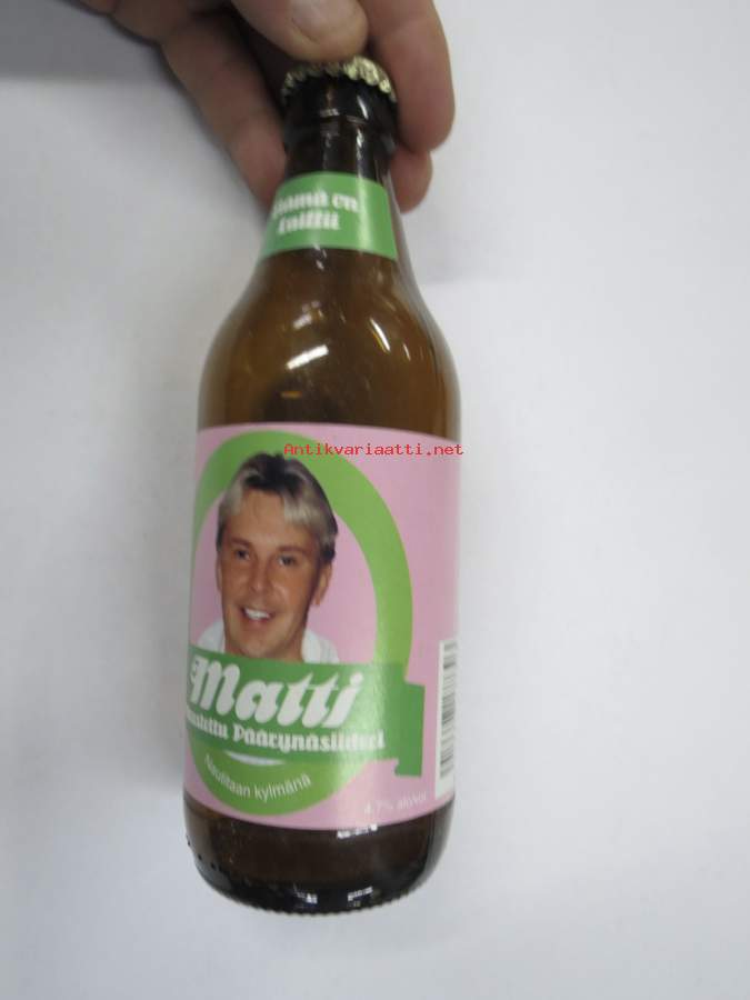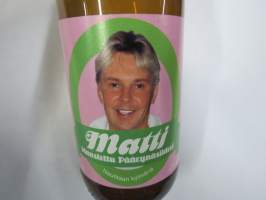Matti - Maustettu Päärynäsiideri - Elämä on laiffii (Matti Nykänen) -siideripullo, jossa etiketti & korkki tallella, tyhjä