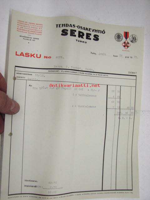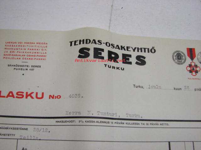 Tehdas Oy Seres, Turku / Niilo Tunturi, Turku, 28.12.1929 -asiakirja