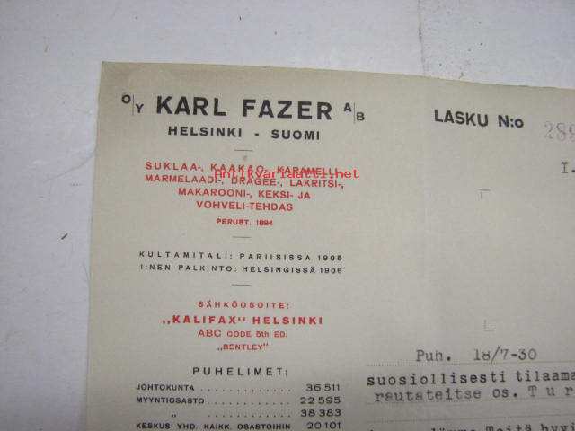 Oy Karl Fazer Ab, Helsinki / Niilo Tunturi, Turku, 24.7.1930 -asiakirja