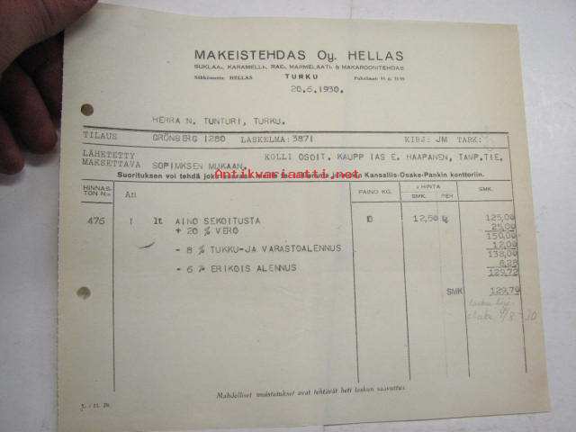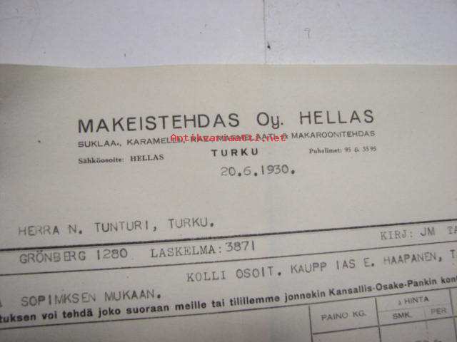 Makeistehdas Oy Hellas, Turku / Niilo Tunturi, Turku, 20.6.1930 -asiakirja