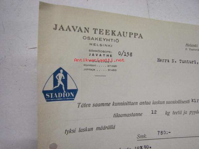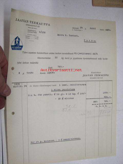 Jaavan Teekauppa Oy, Helsinki / Niilo Tunturi, Turku, 24.4.1930 -asiakirja