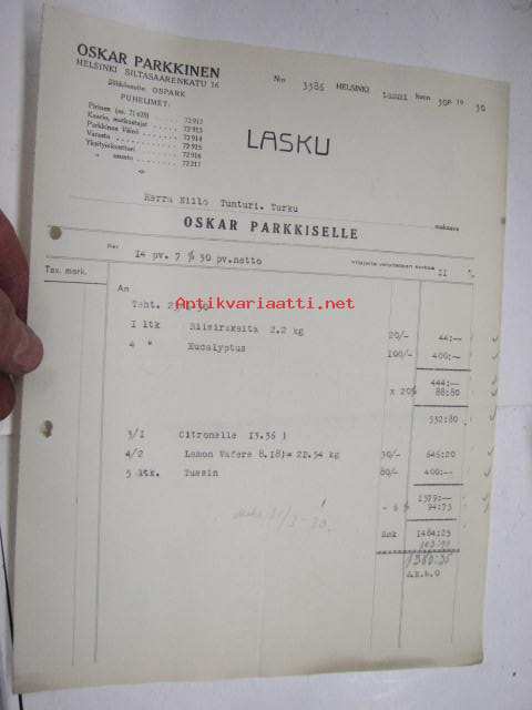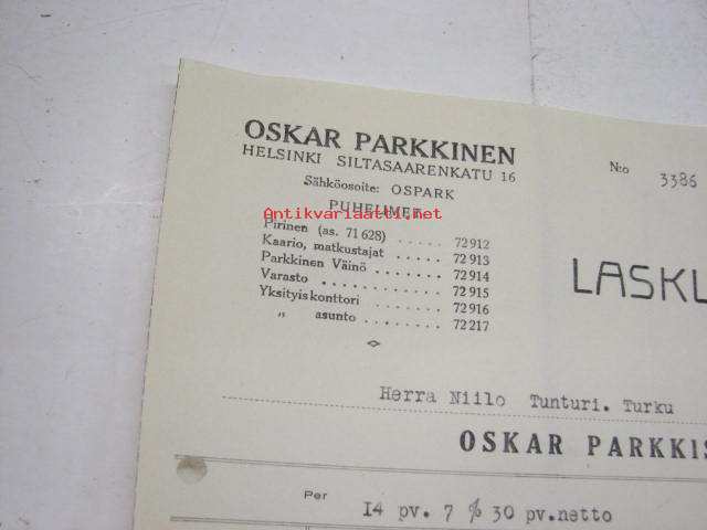 Oskar Parkkinen Oy, Helsinki / Niilo Tunturi, Turku, 30.1.1930 -asiakirja