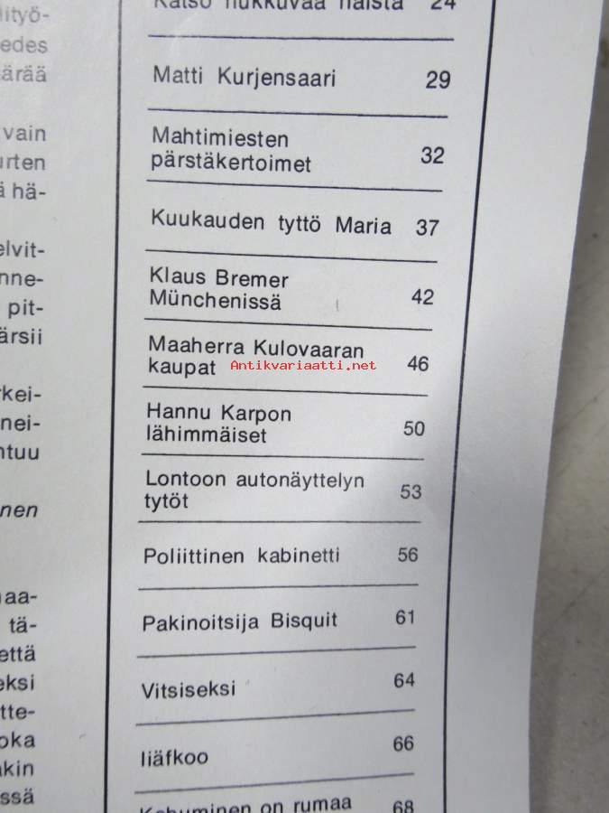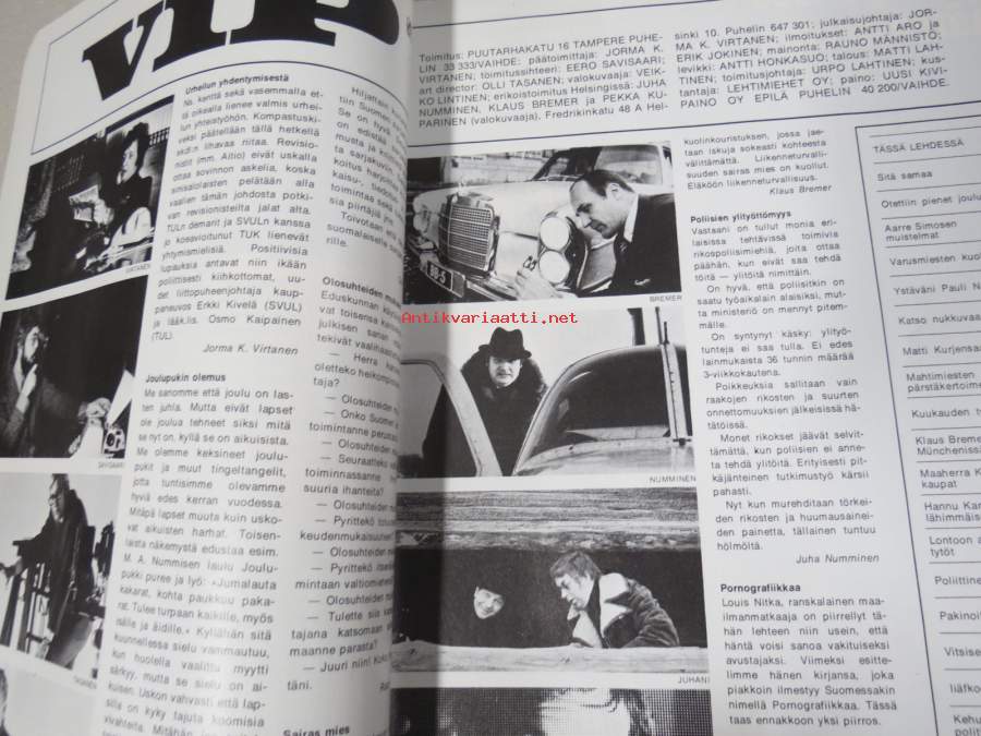 Vip 1971 nr 12, sis. mm. seur. artikkelit / kuvat / mainokset; Otettiin pienet joulut, Aarre Simosen muistelmat 1, Varusmiesten kuolemat lisääntyvät, Elämä alkaa Lamborghinista, Kuinka kauan maaherra Esko Kulovaara saa olla vielä virassaan - epäilyttäviä maakauppoja, suuruudenhulllu palatsisuunnitelma - valtion virastotalon rakennuttaminen sairaalan edelle?, Isojen poikien jouluvippeli -lautapeli, ym.