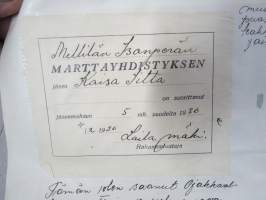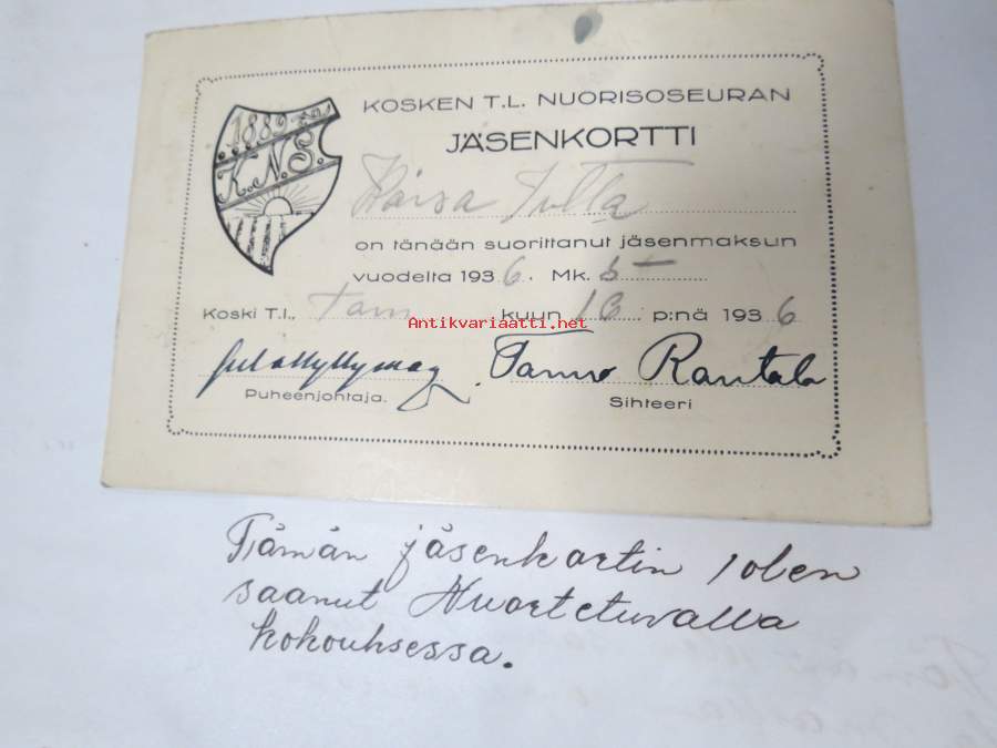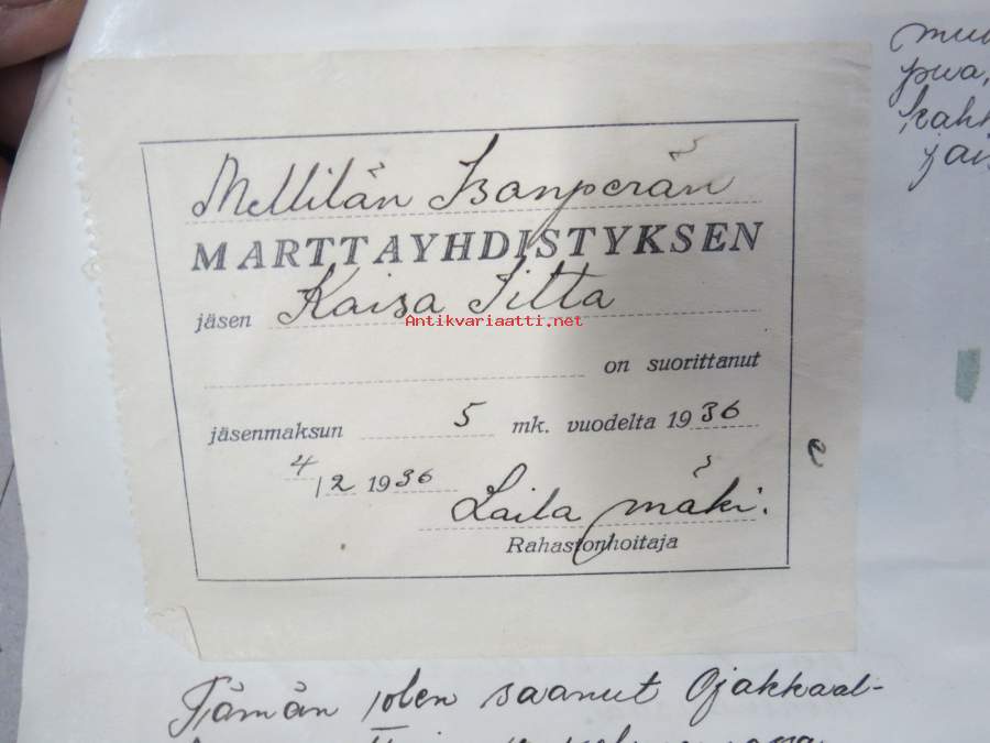 Koski T.L. Suojeluskunta kenttälippu (Lentopäiviltä 25.6.1939), Mellilän Suojeluskunta arpajaiset, Turku-Mellilä VR matkalippu ym. painatteita vihkosivulla