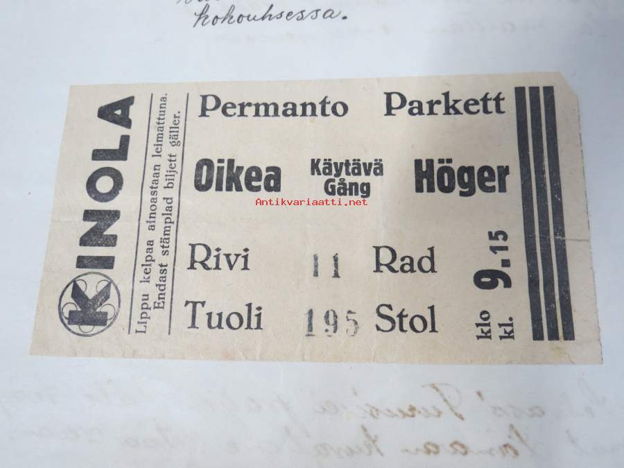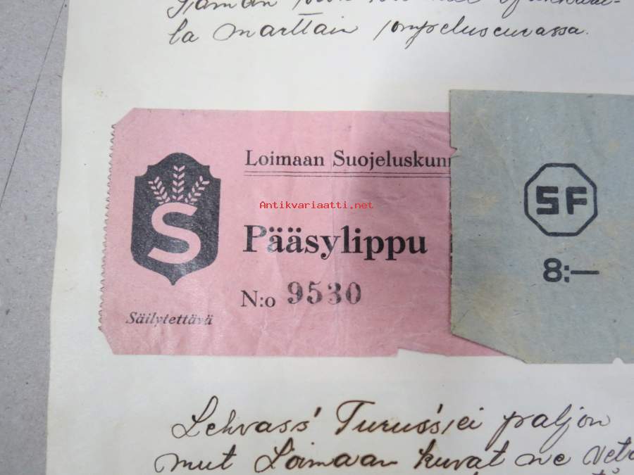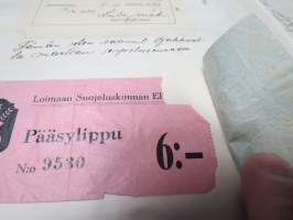 Loimaan Suojeluskunnan Elokuvat pääsylippu ym. lippuja vihkon sivuilla kiinnitettynä