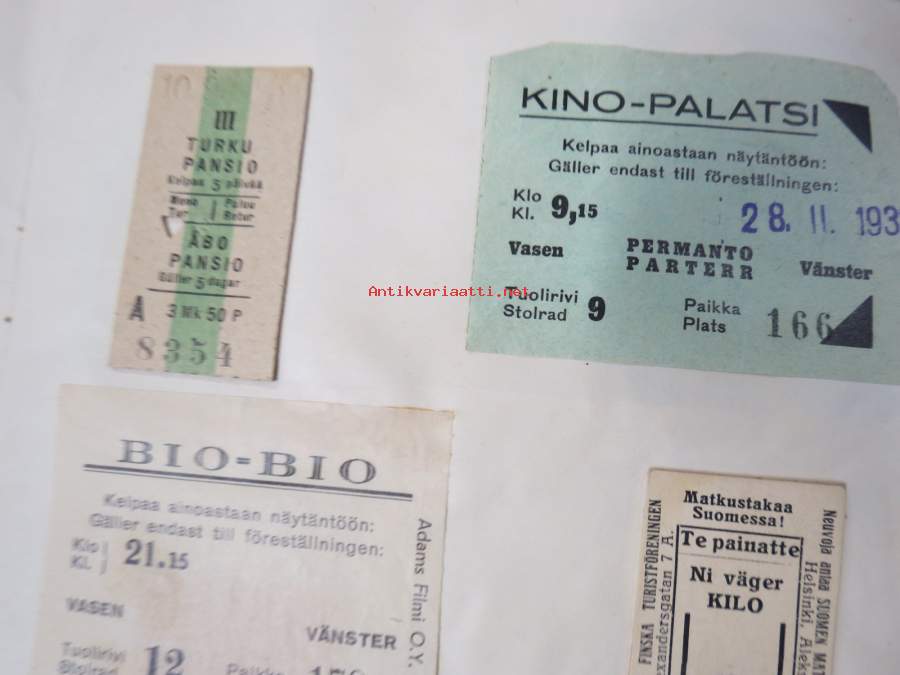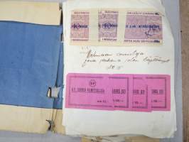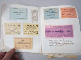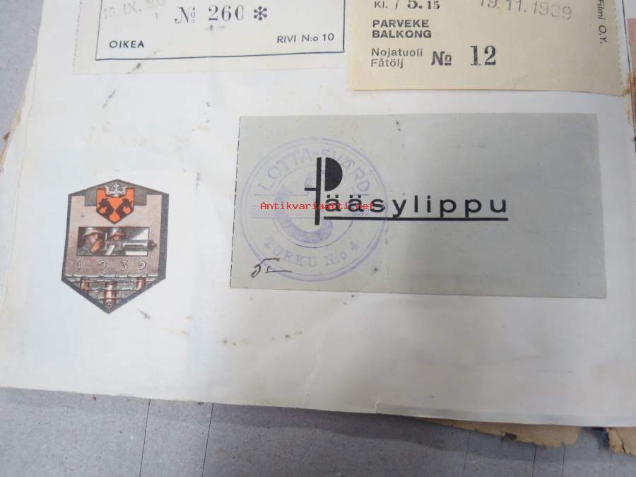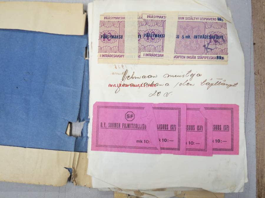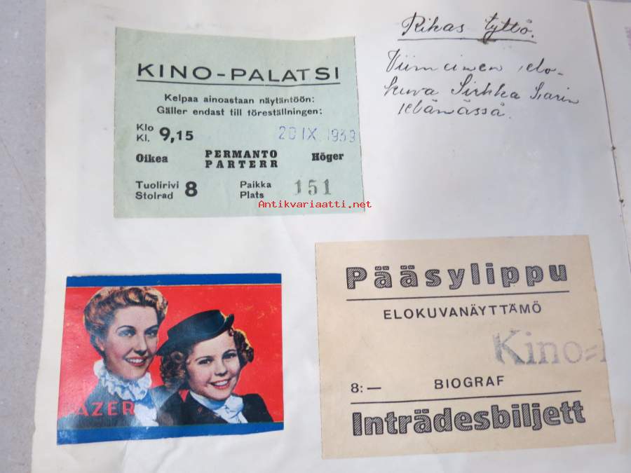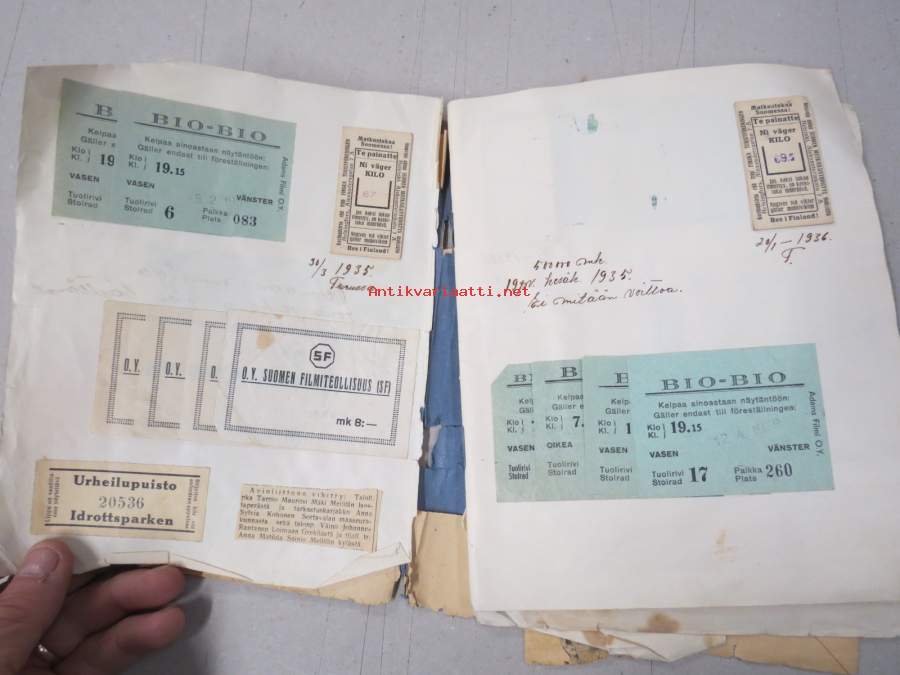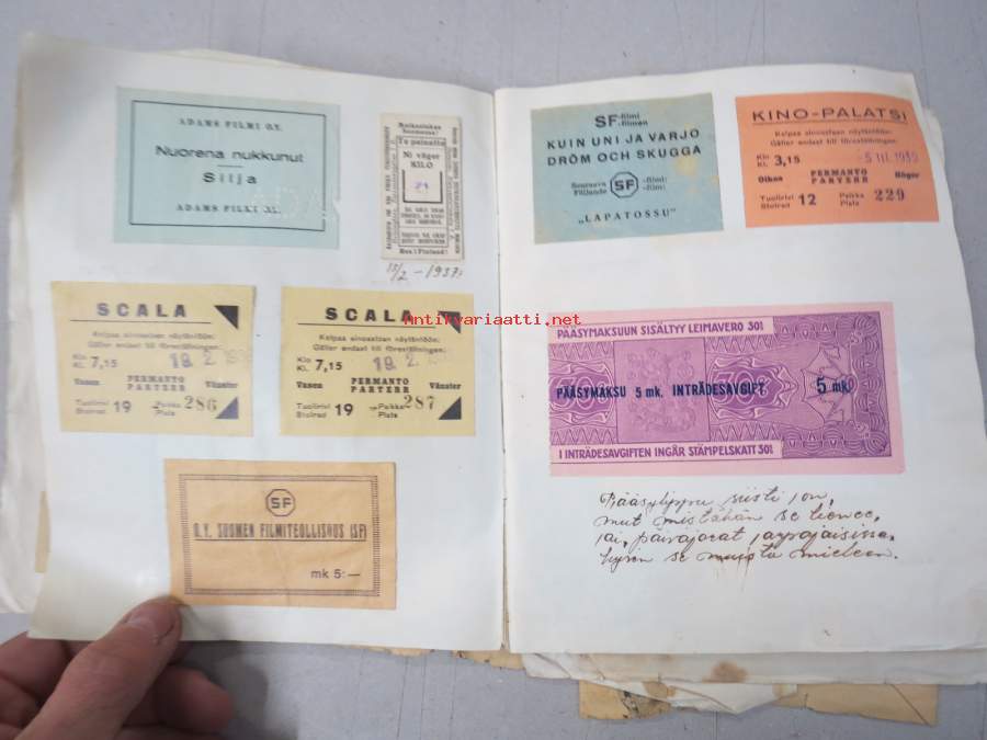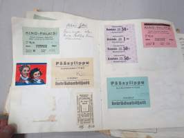 Loimaan Suojeluskunnan Elokuvat pääsylippu ym. lippuja vihkon sivuilla kiinnitettynä Näytä