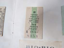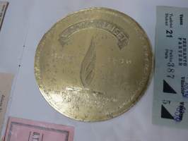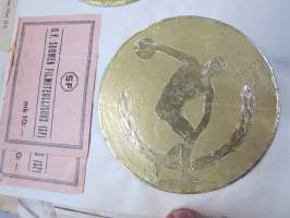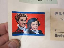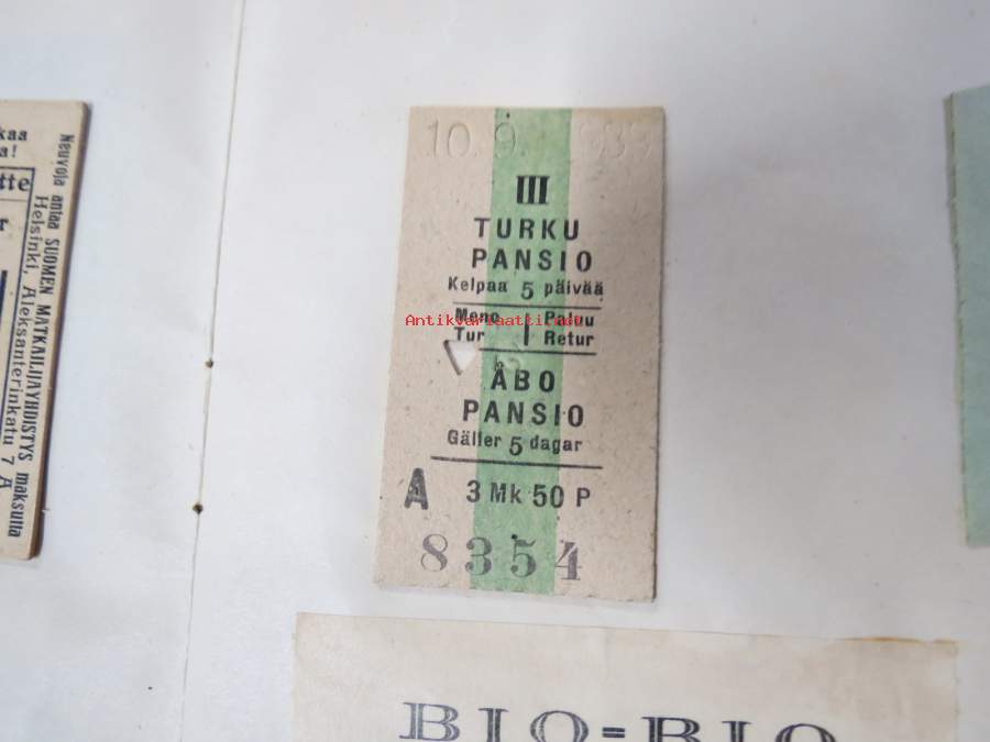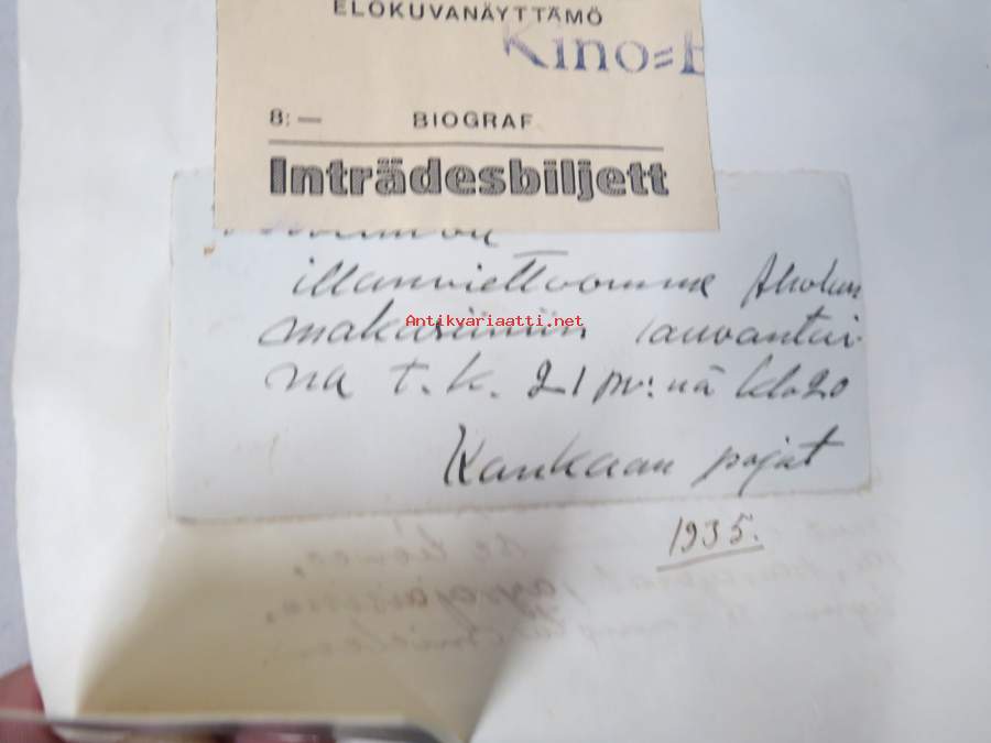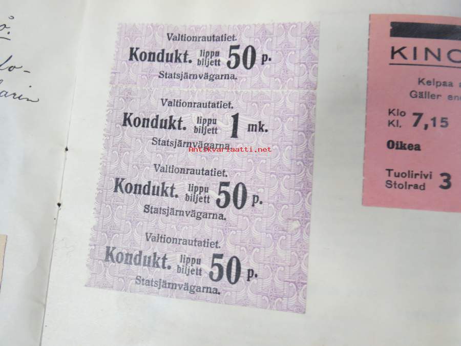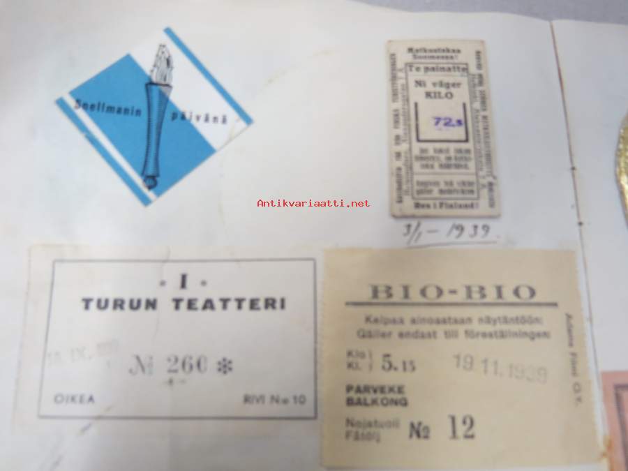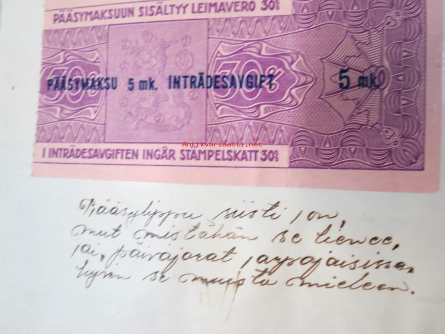 Loimaan Suojeluskunnan Elokuvat pääsylippu ym. lippuja vihkon sivuilla kiinnitettynä Näytä
