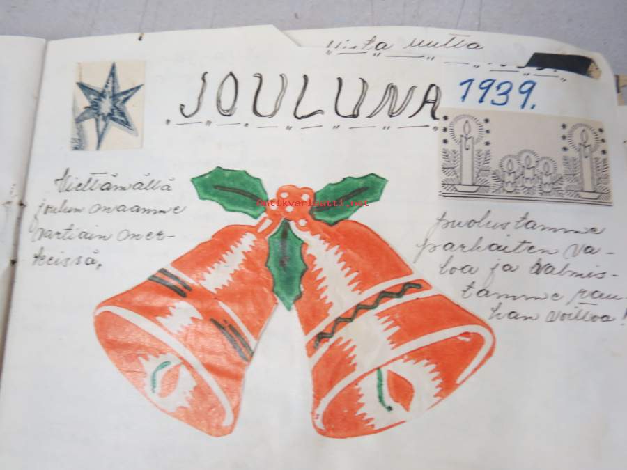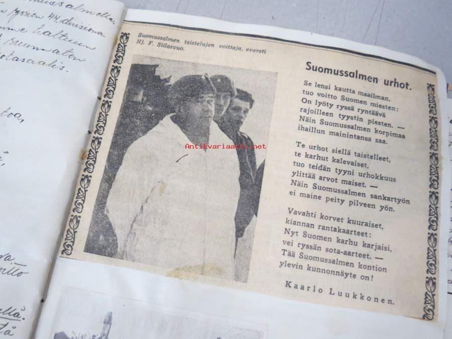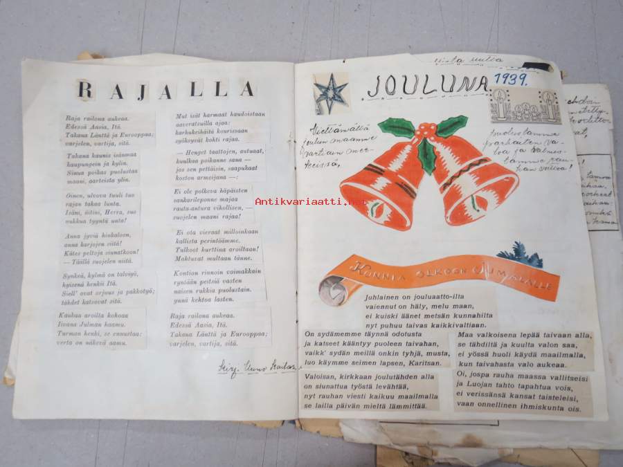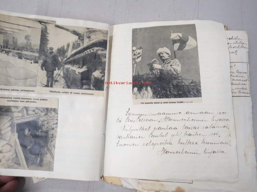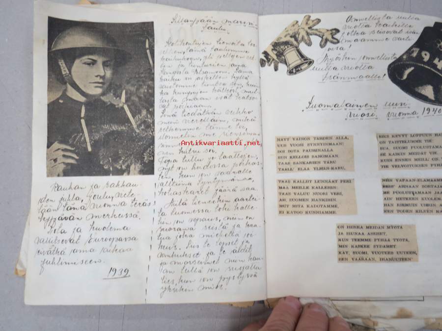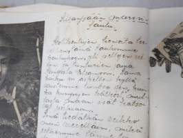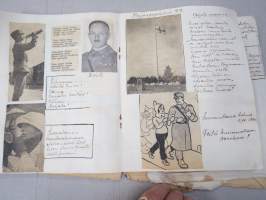 Koulutytön / nuoren neidin leikevihko / "päiväkirja", johon liimattu pääsylippuja ym, paljon Talvisodan ajan asiaa, tekijä mahdollisesti kotoisin Mellilästä?