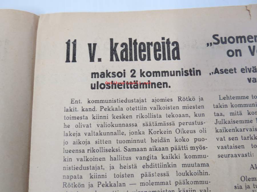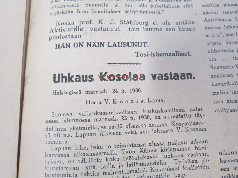 Aktivisti 1930 nr 14 - Lapuanliikkeen äänenkannattaja, Lapuan kokouksen julkilausuma, 11. vuotta kaltereita maksoi 2 kommunistin ulosheittäminen, Uhkaus Kosolalle ym