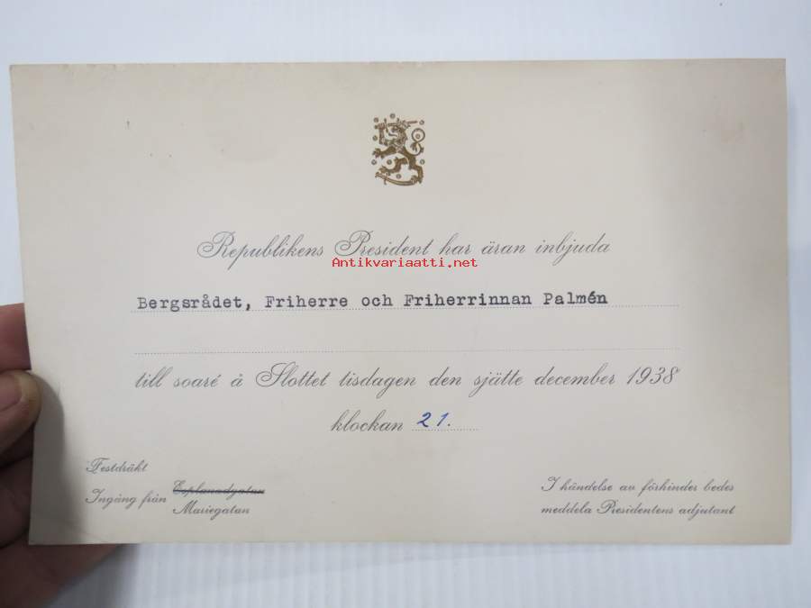 Republikens President har äran att inbjuda Bergsrådet , Friherre och Friherrinnan Palmén till soare i Slottet 6.12.1938 -kutsu itsenäisyyspäivän vastaanotolle