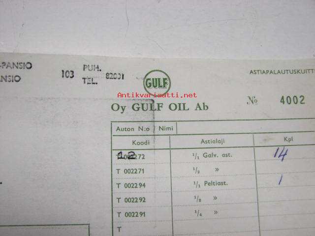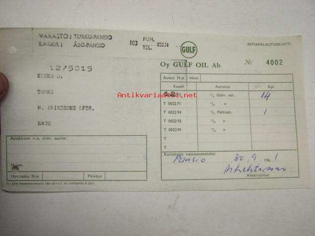 Oy Gulf Oil Ab -astiapalautuskuitti 30.9.1961