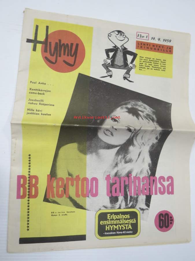Hymy 1959 nr 1 - ensimmäinen ilmestynyt numero, kansikuva + artikkeli Brigitte Bardot, Kanttikärryjen comeback, Sorretaanko nuorisoa?, Jazz-basilli riehuu KOPIO Näytä