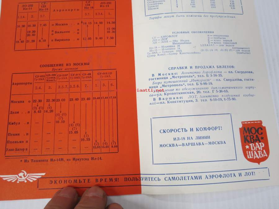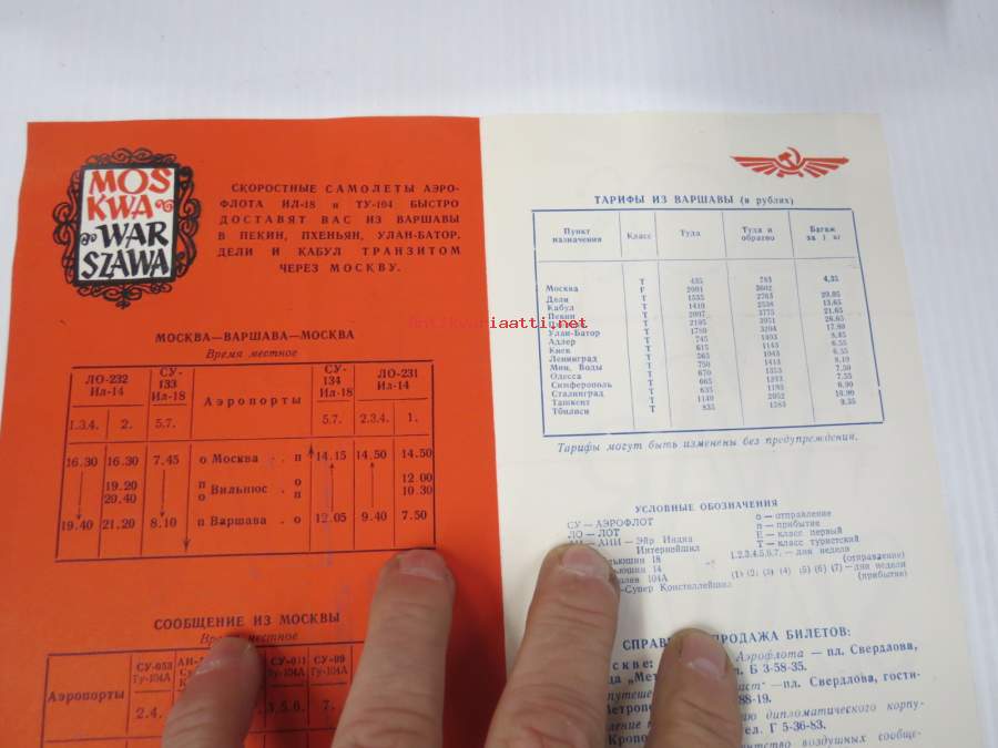 Aeroflot / ZSSR, Moskva - Warszawa -lentoreitin tariffit ja aikataulut 1960, venäjänkielinen