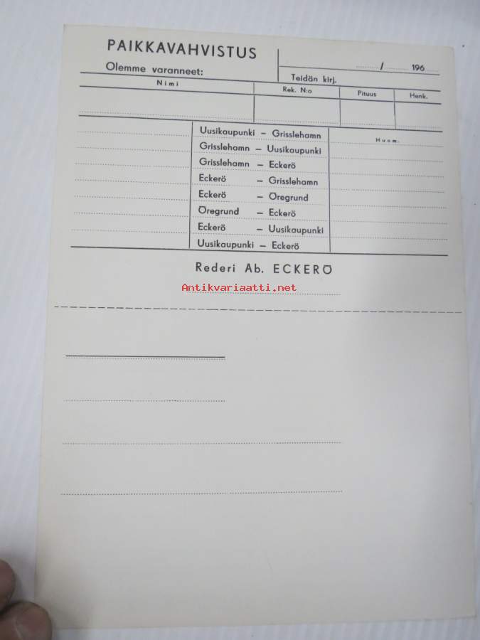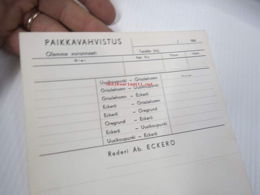 Eckerölinjen Henkilölippu nr 452 Uusikaupunki-Grisslehamn-Eckerö-Öregrund, paikkavahvistuslomake (lähetetty asiakkaalle ja toinen osa jäänyt konttoriin Näytä