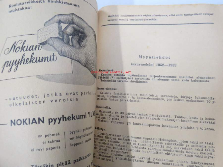 Koulutarpeiden Keskusliike, 195214 x 21 cm, kattava luettelo koulutarvikkeista - kohtuullisen runsas kuvitus.