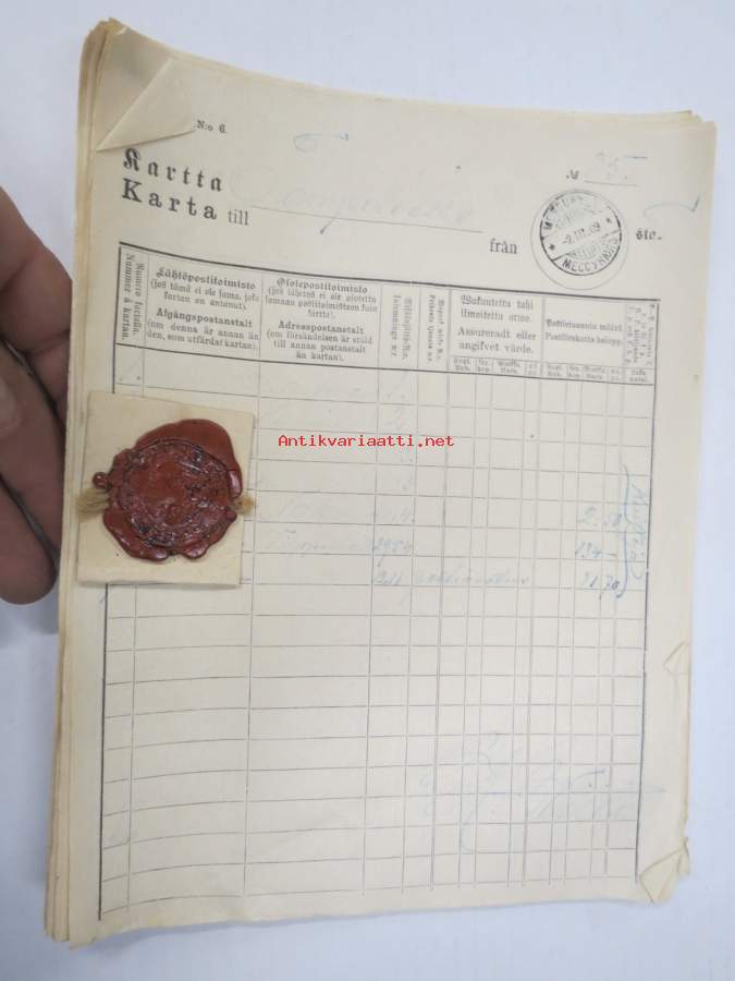 19 x 26 cm postihistoriallinen kohde, 20 erillistä lomaketta niputettu yhteen.