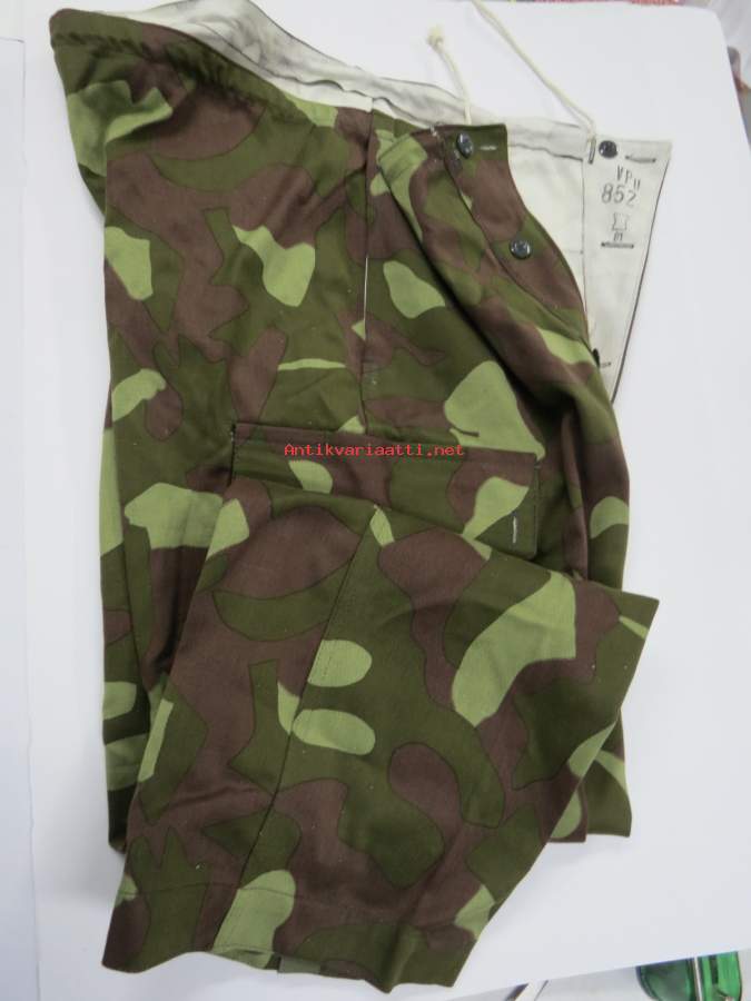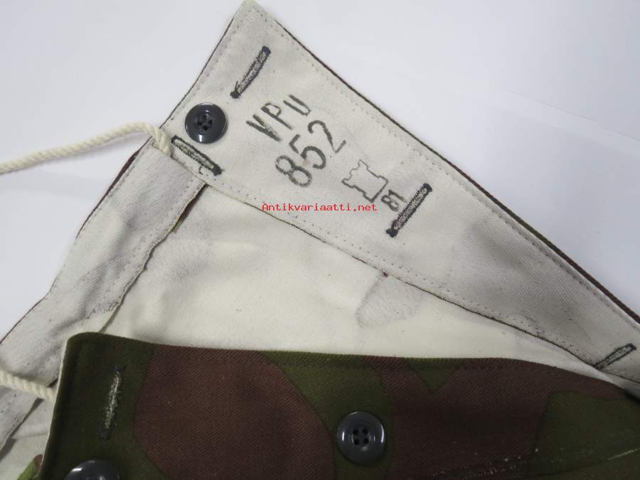 SA Vpu M62 (vm. 62-79) maastopuvun housut, leimattu "VPu 852 Torni + 81" eli Valtion Pukutehdas koko 52 valmistettu 1981 -aito, käyttämätön