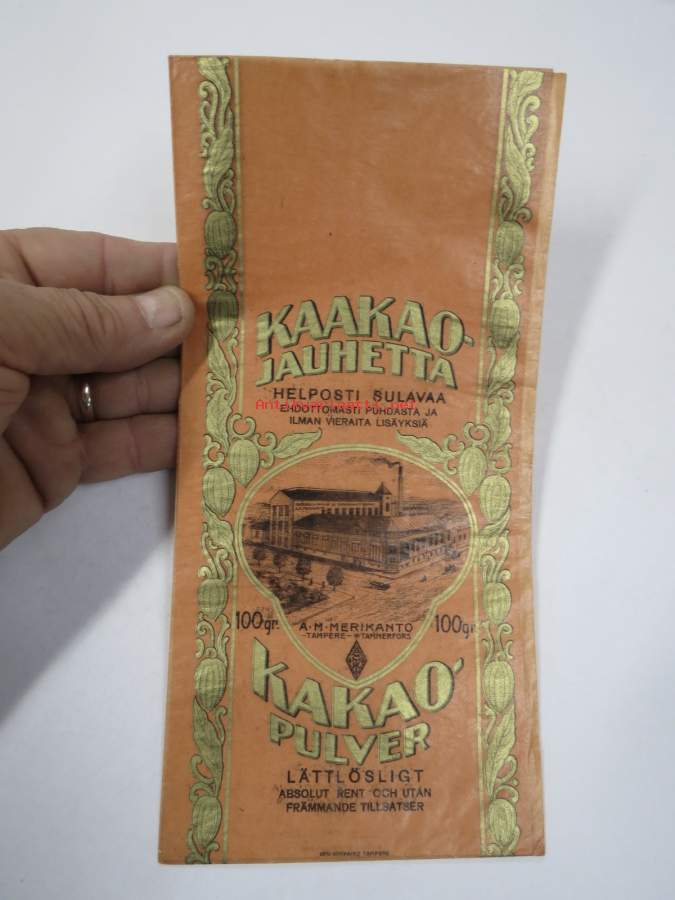 Kaakaojauhetta - Kakaopulver - A.M. Merikanto, Tampere - Tammerfors -pussi / tuotepakkaus