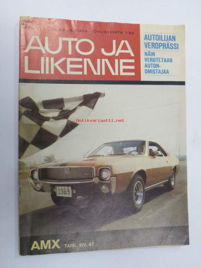 Auto ja Liikenne 1968 nr 10, sis. mm. seur. artikkelit / kuvat / mainokset; Kansikuva AMX, Champion Turbotulppa, Thai International, Autoilijan veroprässi, Austin 1300, Mazda 1500 de luxe, Rengastietoa, Ford vuodelta 1903, Auto talvikuntoon - autokemikaalit - hyvä kuvitus purkeista ja pulloista, Shell Super, ym. 21 x 30 cm.