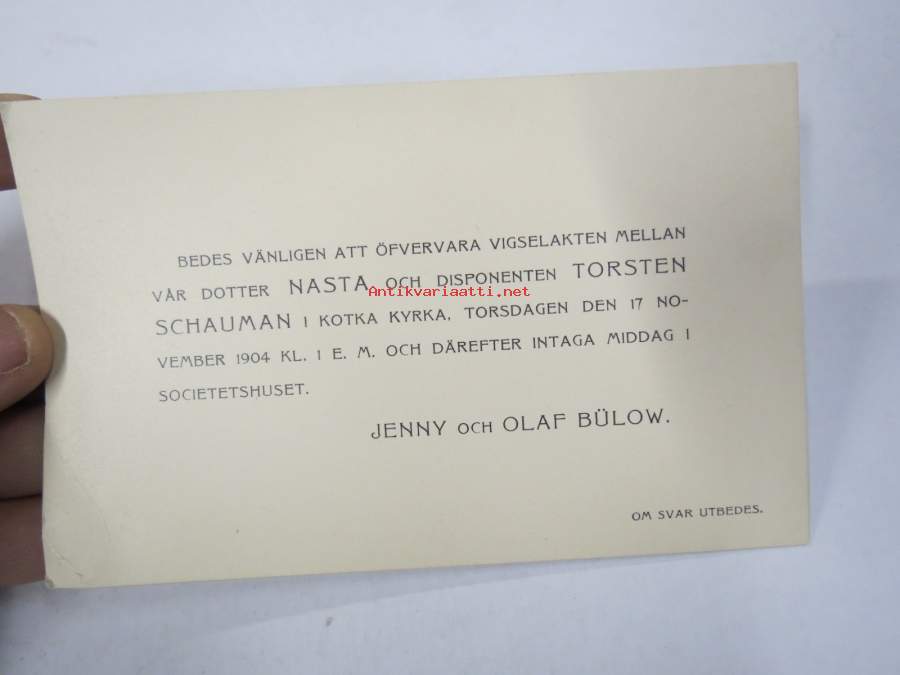 Dedes vänligen att öfverfara vigselakten... vår dotter Nasta von Bülow och Torsten Schauman i Kotka kyrka 17.11.1904... Jenny & Olaf Bülow -kutsukortti
