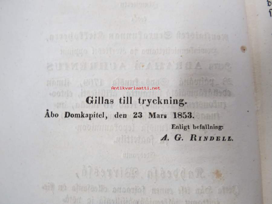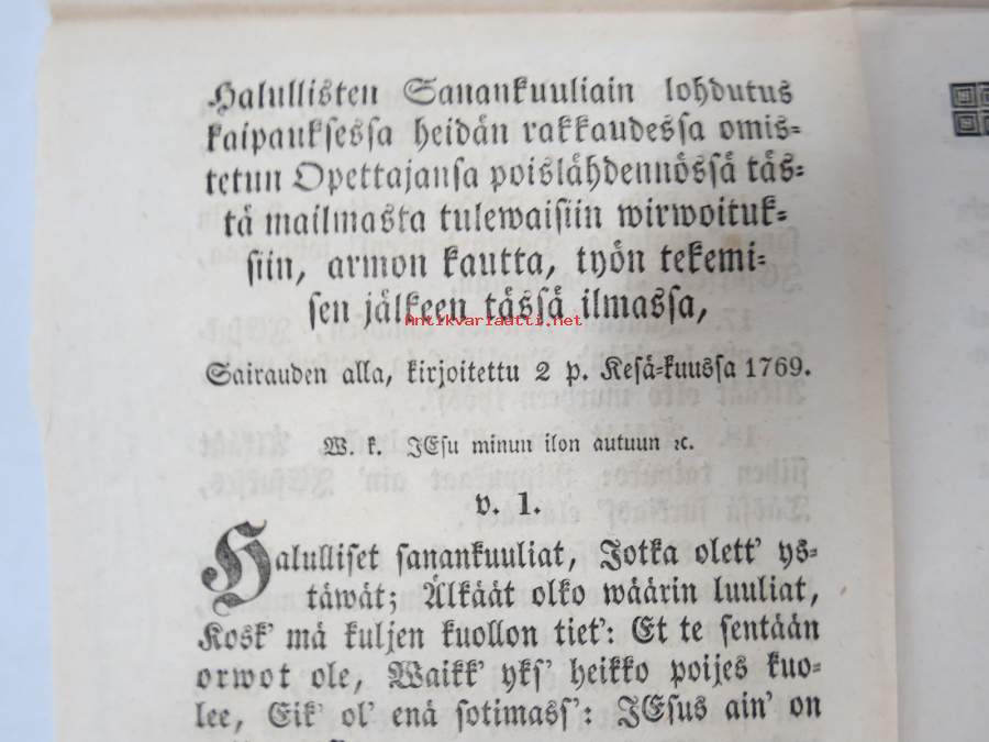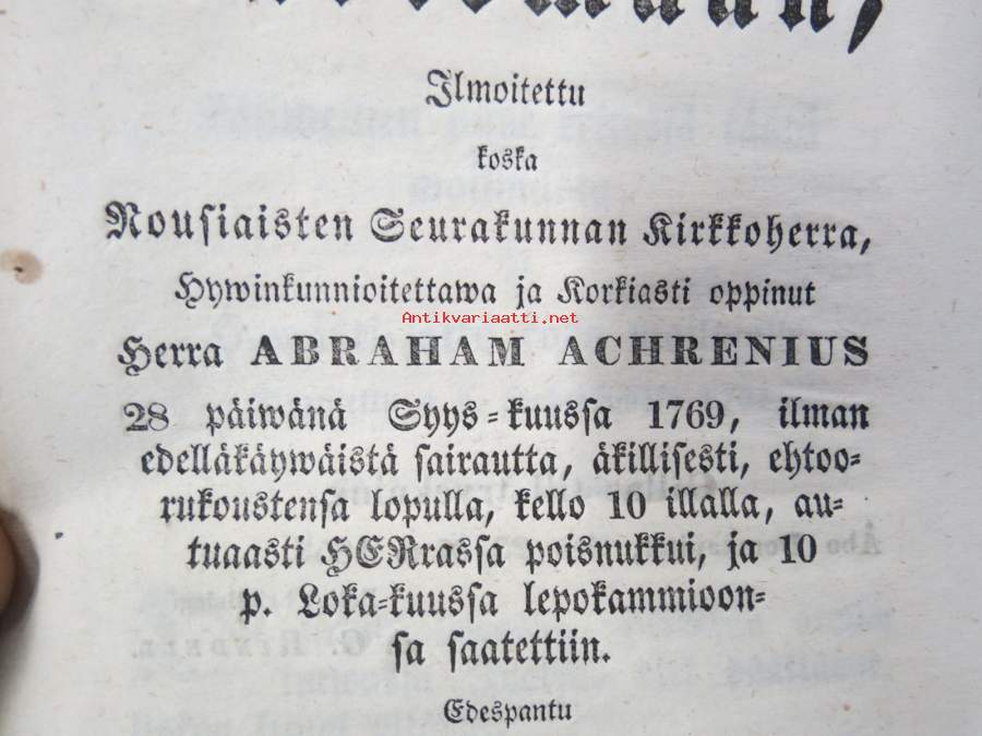 aikainen valmistus kuolemaan, Ilmoitettu koska Nousiaisten Seurakunnan Kirkkoherra... Abraham Achrenius 28.9.1769, ilman edelläkäywäistä.... edespantu 2 wirrestä Näytä