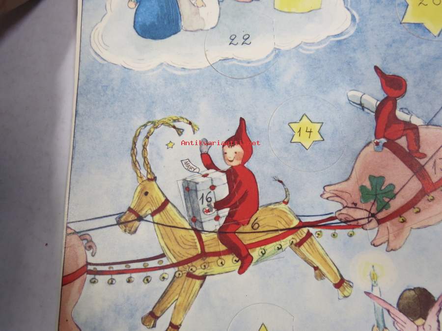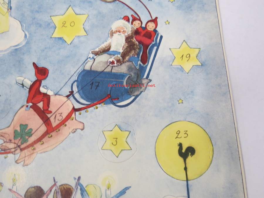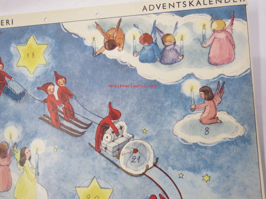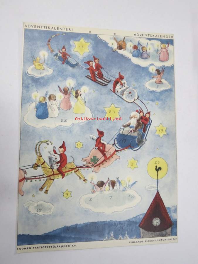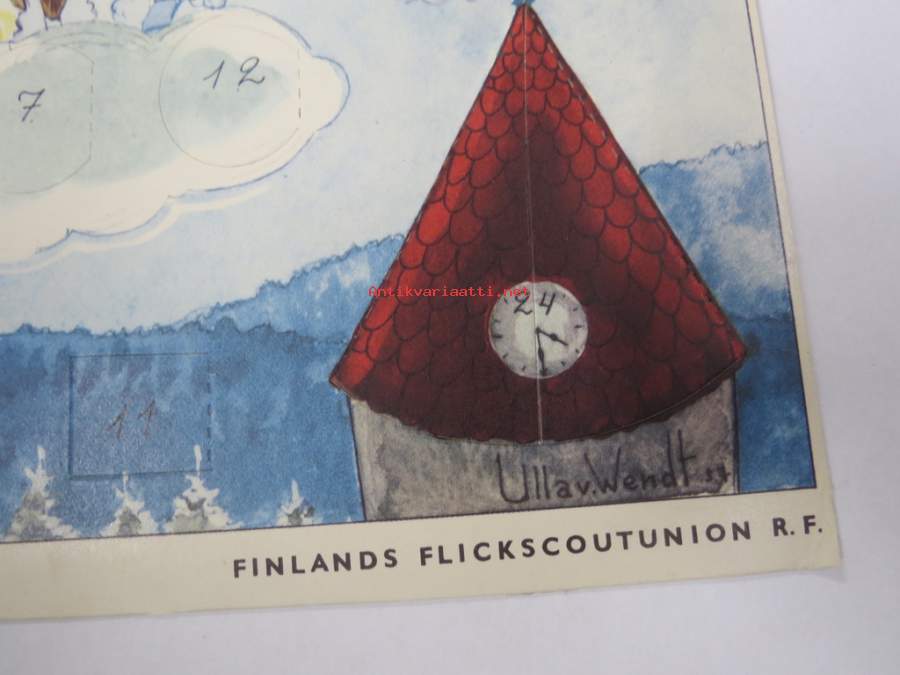 Adventtikalenteri / Joulukalenteri - Suomen Partiotyttöjärjestö - Finlands Flickscoutunion, piirtänyt Ulla von Wendt 1957