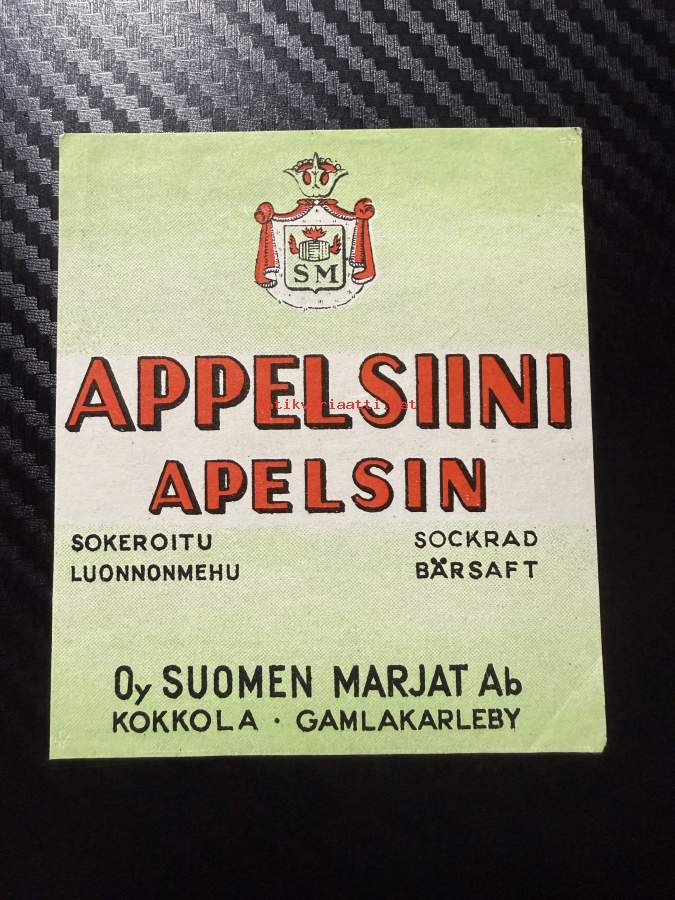 Appelsiini sokeroitu luonnonmehu -etiketti