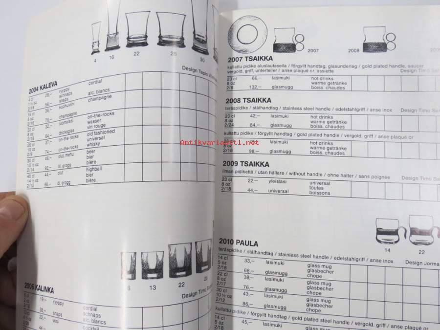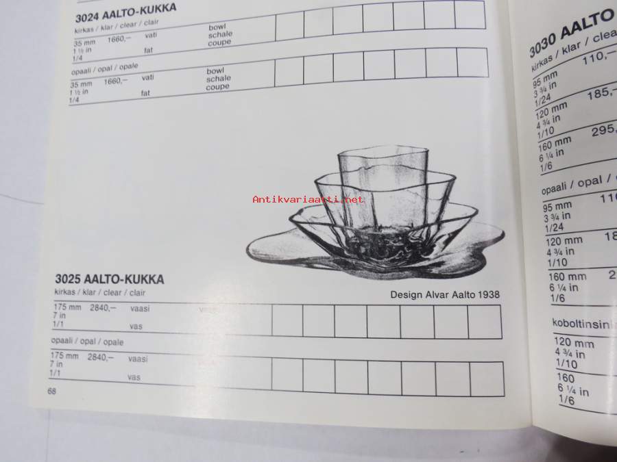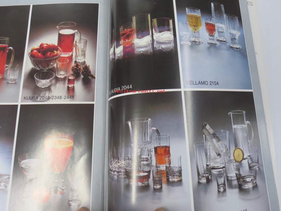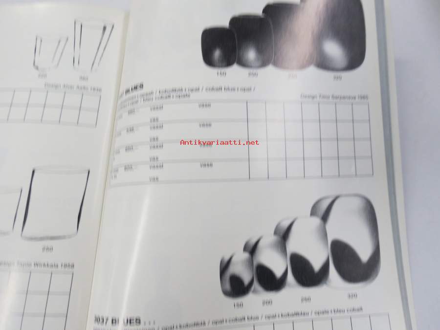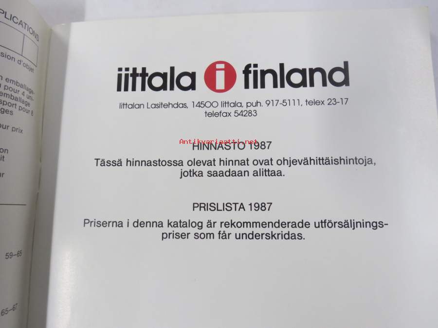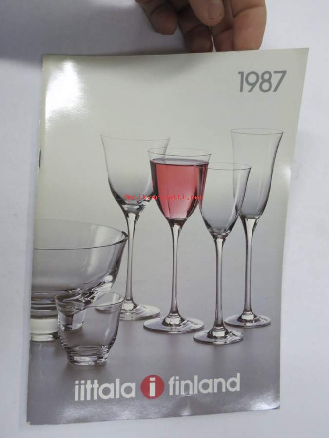 Iittala 1987 -tuoteluettelo, tuotanto mittoineen ja sunnittelijatietoineen, myös taidelasi Aalto ym.