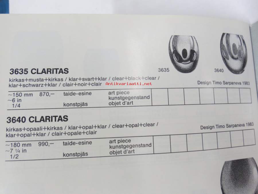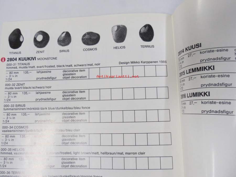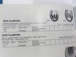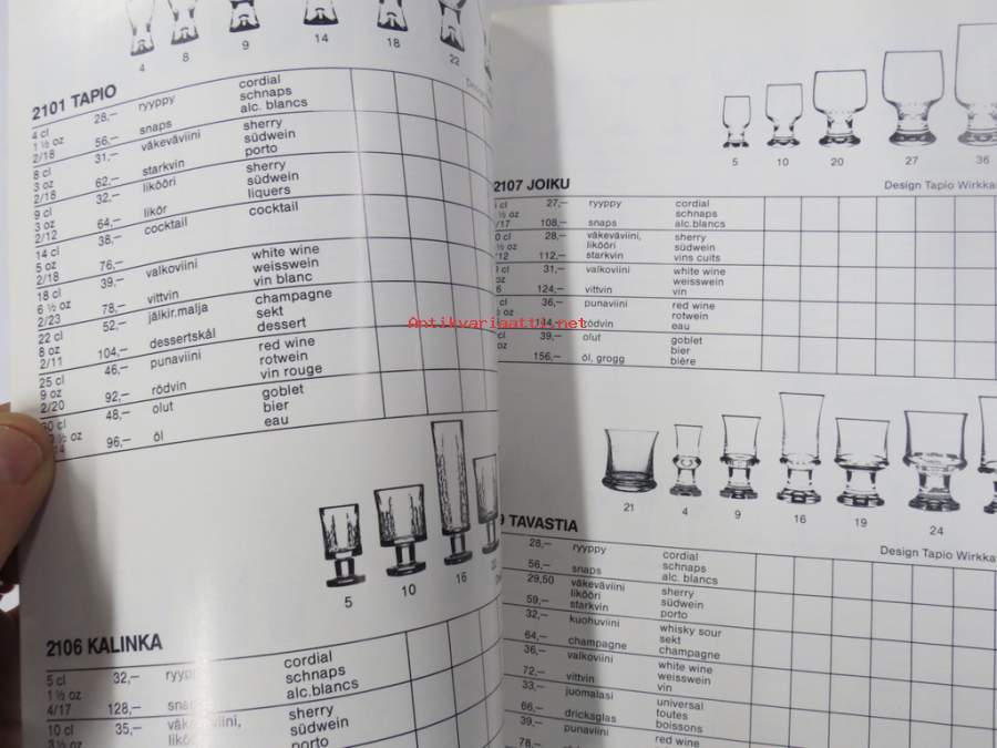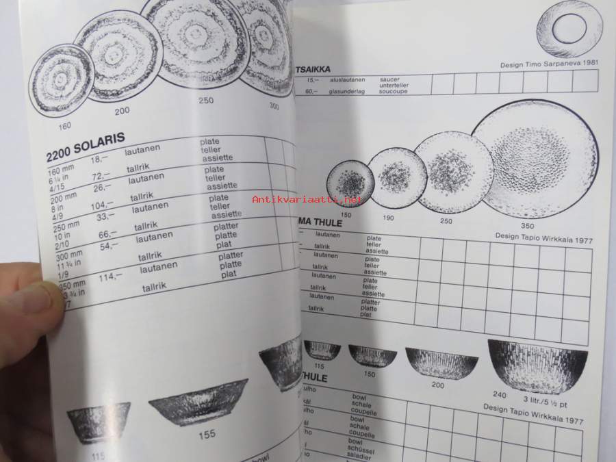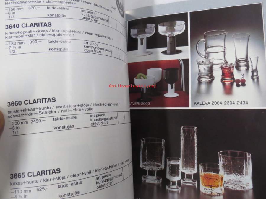 Iittala 1987 -tuoteluettelo, tuotanto mittoineen ja sunnittelijatietoineen, myös taidelasi Aalto ym.