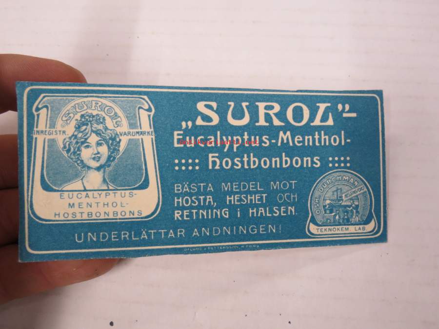 Surol - Eucalyptus-Menthol Hostbonbons (Oscar Durchman Teknokem. Lab. Helsingfors) -etiketti, ruotsinkielinen, 1800-luvulta