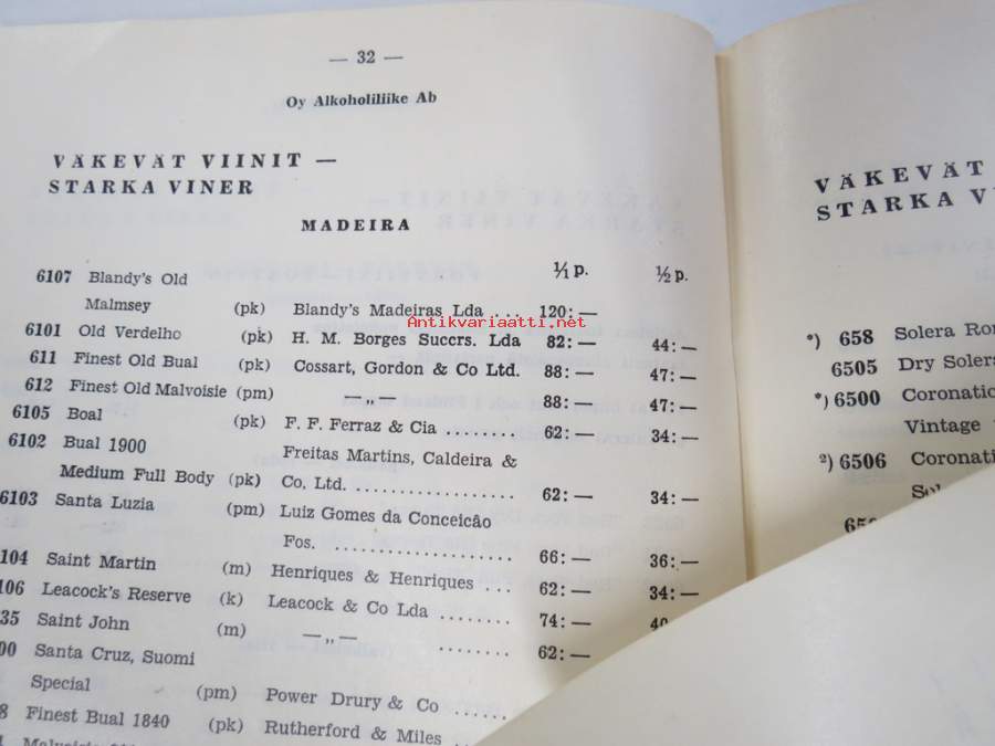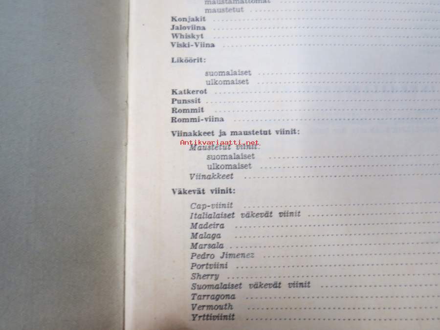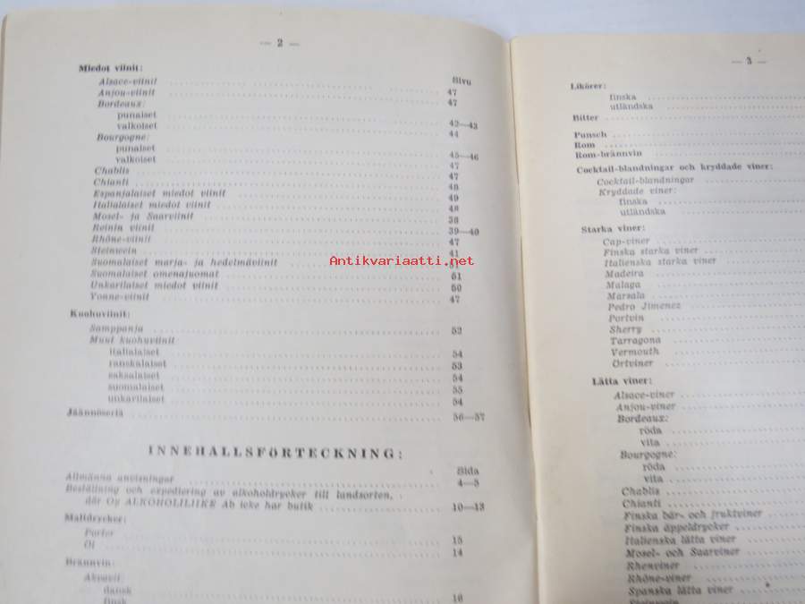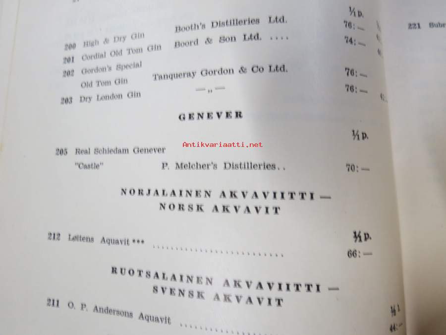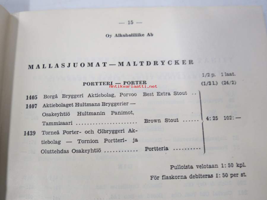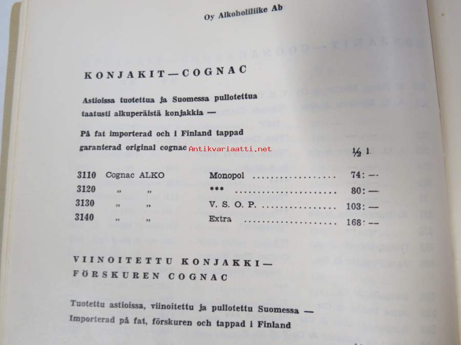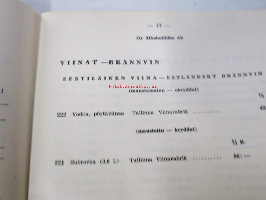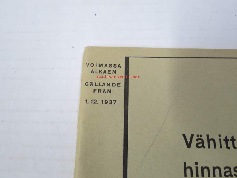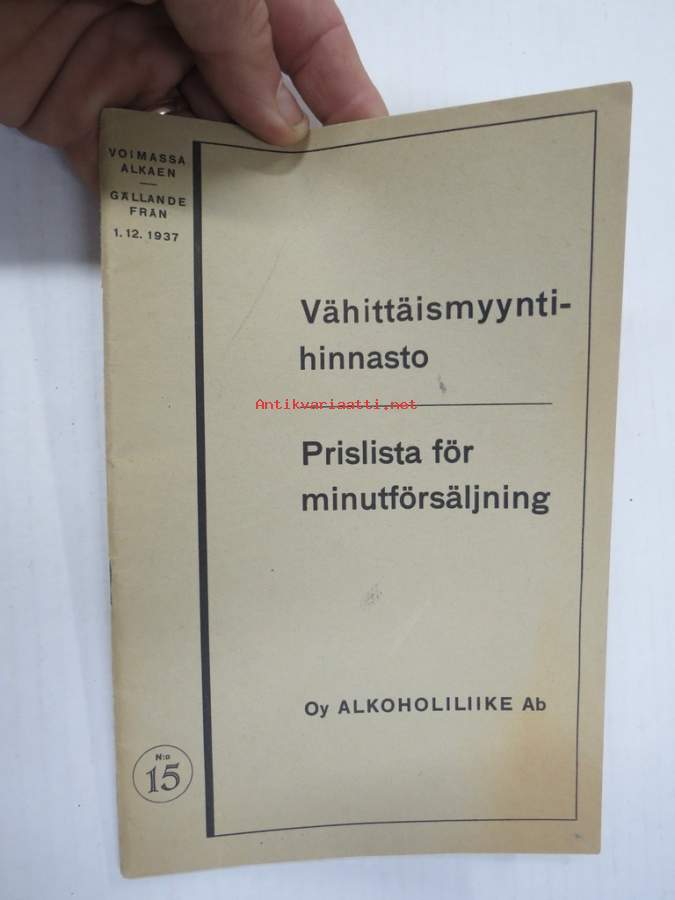 Alko vähittäismyyntihinnasto alkaen 1.12.1937 / Prislista för minutörsäljning