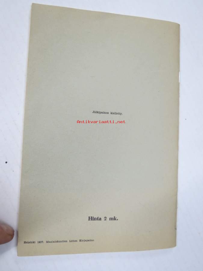| Saatavilla | 1 kpl | | Julkaisuvuosi | 1937 | | Sivuja | 57 | | Kunto | K3 | | Sidonta/painoasu | Nidottu (pehmeäk.) | | Kielet | Suomi |