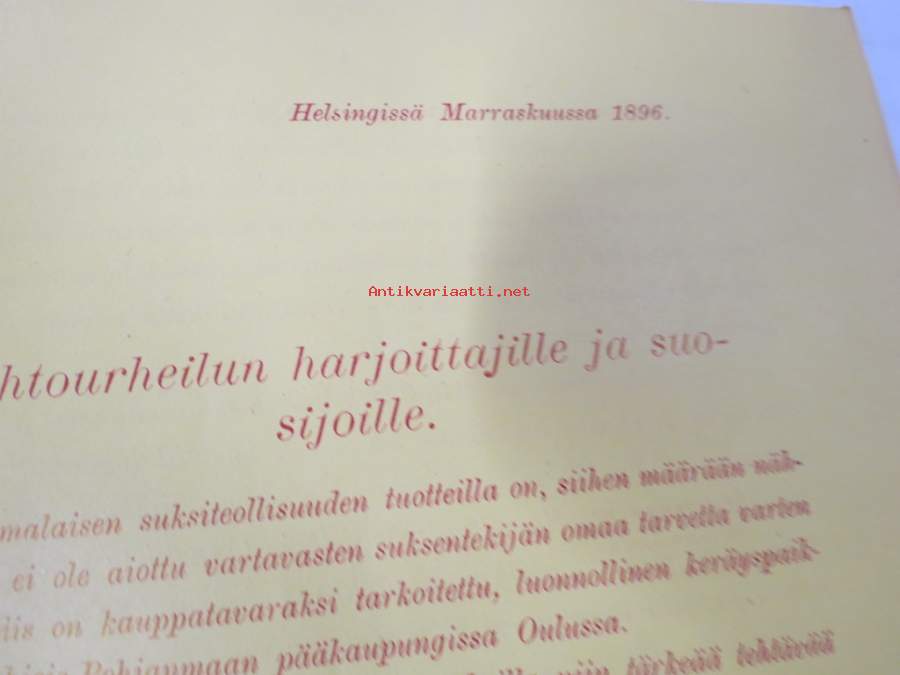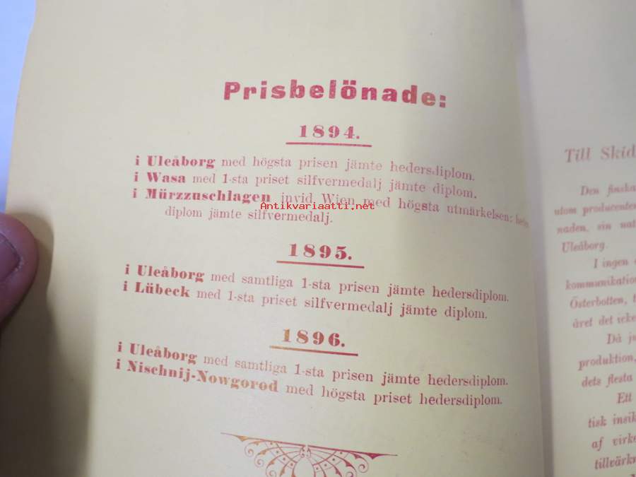 Brandt & Blomberg, Turku - Helsinki - Oulu, Hintaluettelo suksista ja suksitarpeista 1896; Ylitornion, Haapaveden ja Kajaanin suksimallit, sis. artikkelin Oulusta...