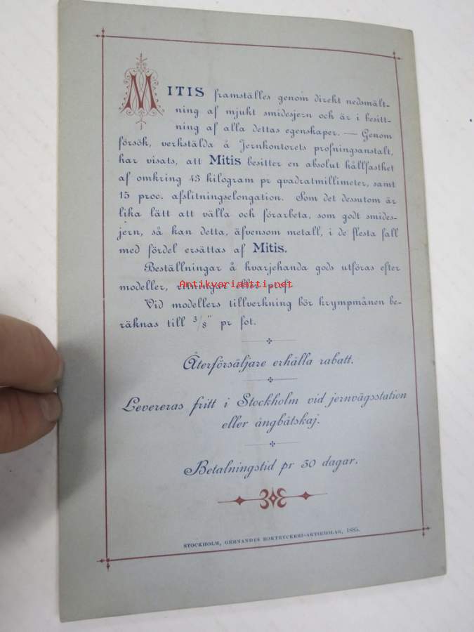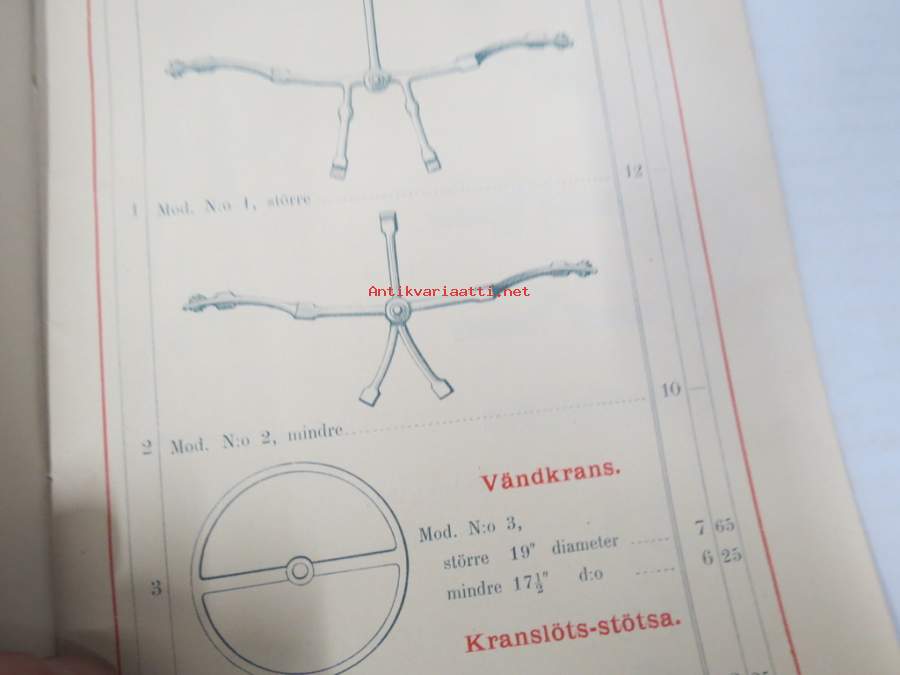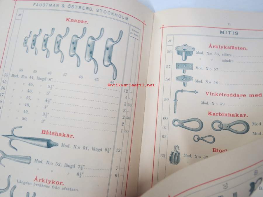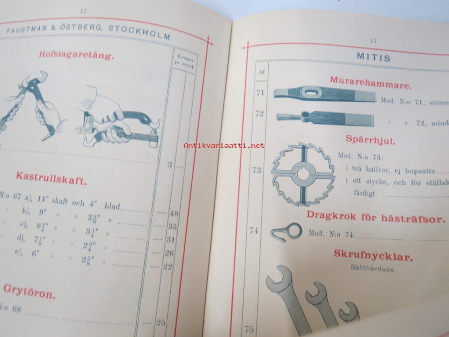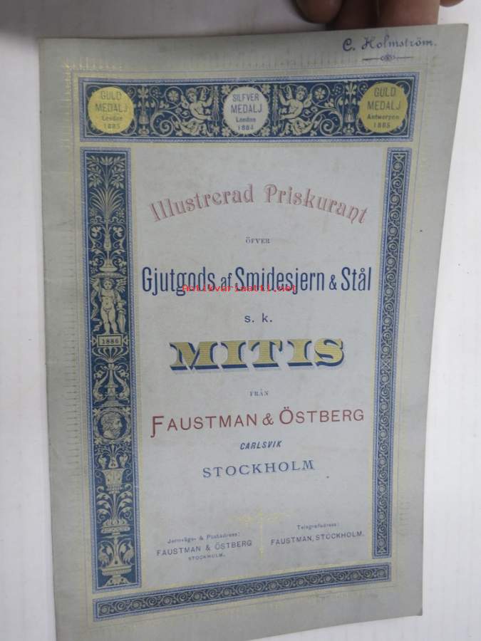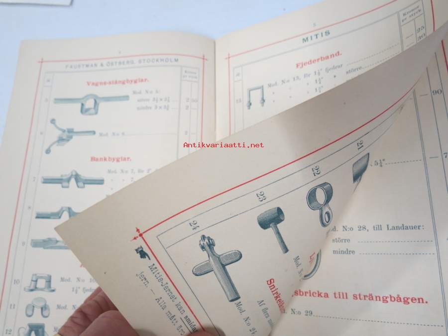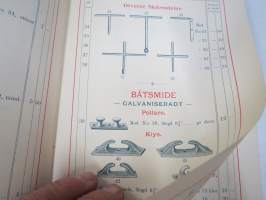 Illustrerad Priskurant öfver Gjutgods af Smidjesjern & Stål s.k. MITIS från Faustman & Östberg (Carlsvik, Stockholm), 1885 -hintaluettelo erilaisille takeille ym.