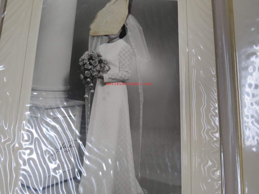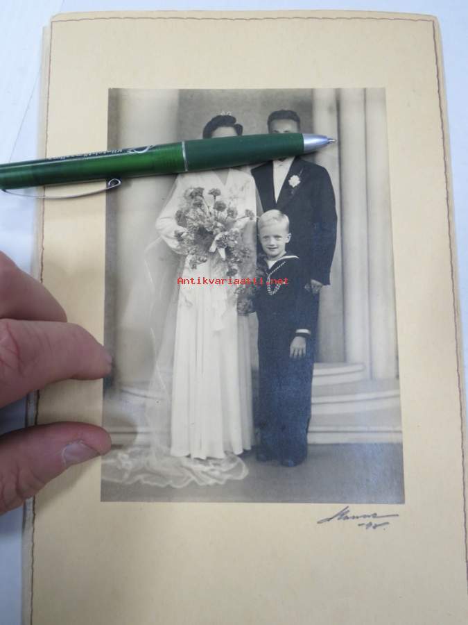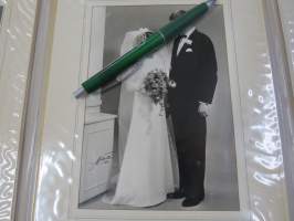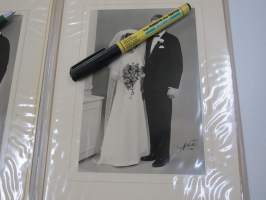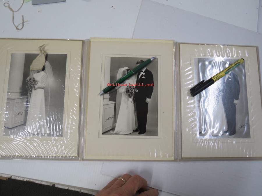 Hääkuvakansio / vihkikuvakansio 1968 - ajalle tyypillinen - Valokuvaamo Ahti, kansiossa kolme kappaletta 12 x 17 cm kuvia