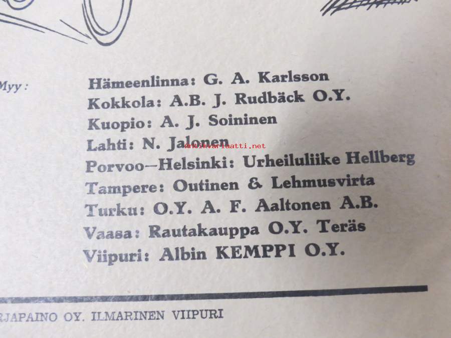 | Saatavilla | 1 kpl | | Julkaisuvuosi | 1935 | | Sivuja | 24 | | Kunto | K2 | | Kannessa varjostumaa | | Sidonta/painoasu | Nidottu (pehmeäk.) | | Kielet | Suomi |