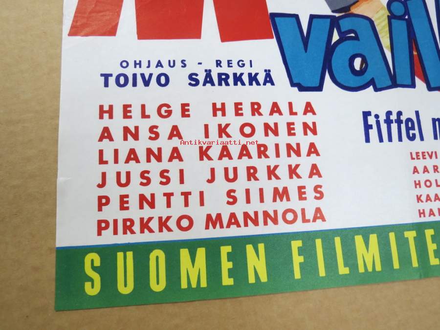 Miljoonavaillinki -elokuvajuliste, käsikirjoitus Mika Waltari, ohjaus Toivo Särkkä, osissa Helge Herala, Ansa Ikonen, Liana Kaarina, Jussi Jurkka, Pirkko Mannola Näytä