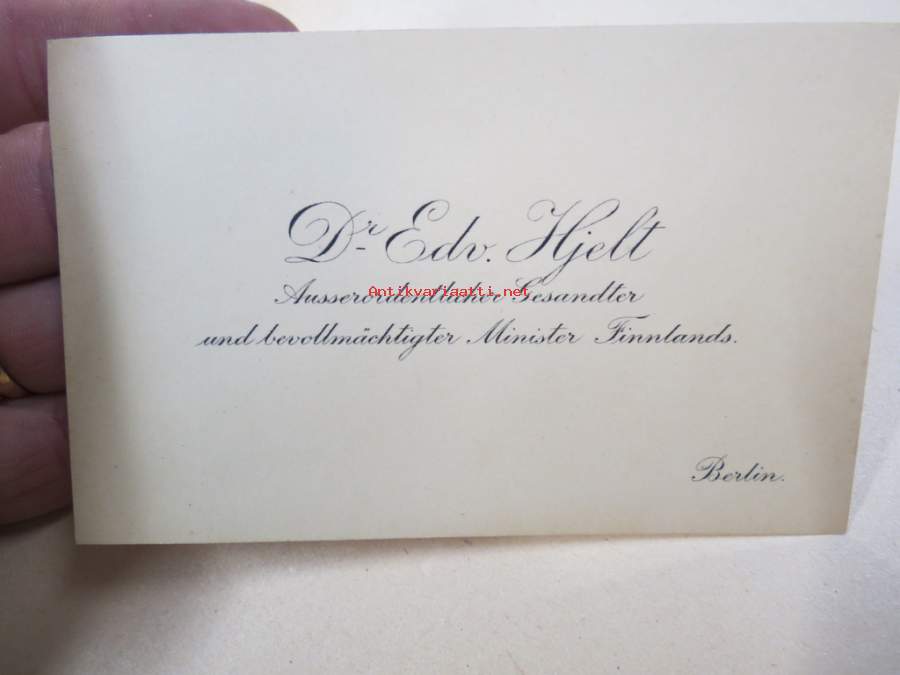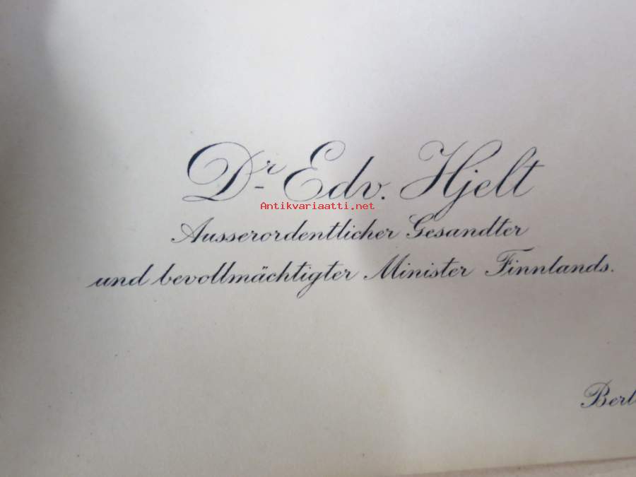 Dr Edv. (Edvard) Hjelt, Ausserordentlicher Gesandter und bevollmaächtiger Minister Finnlands, Berlin -käyntikortti, ajalta jolloin Hjelt oli täysivaltaisena... Näytä