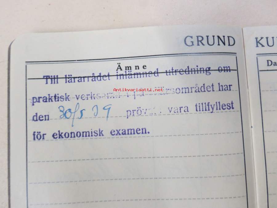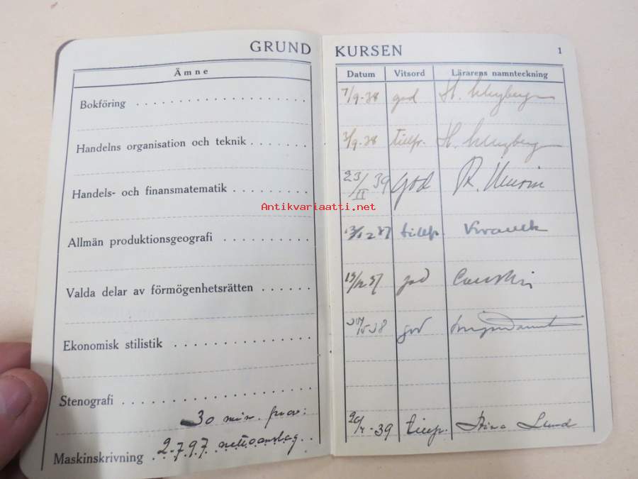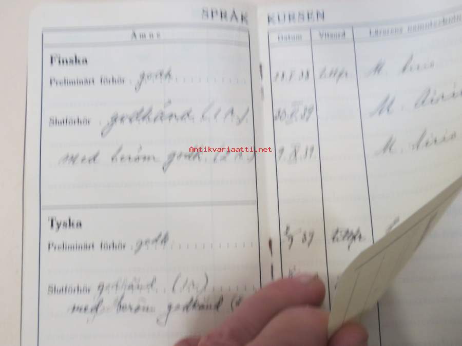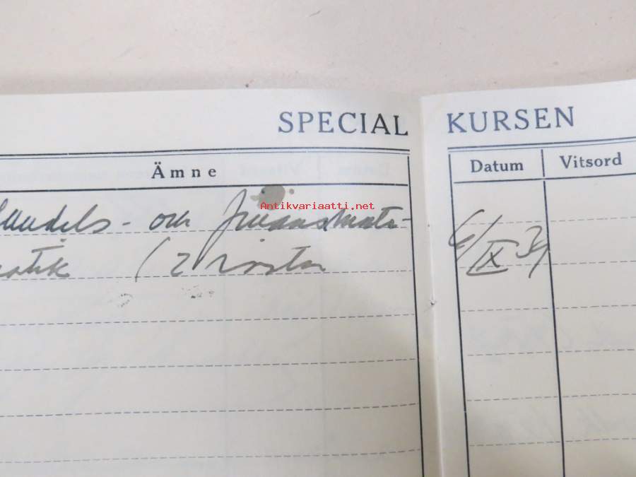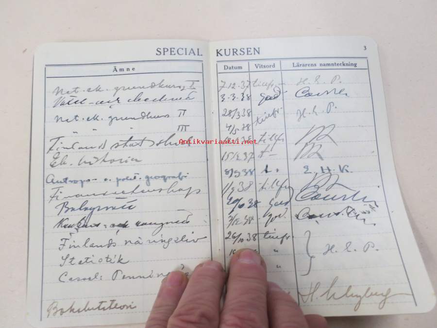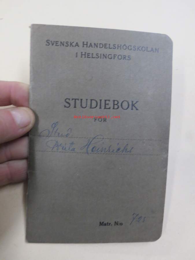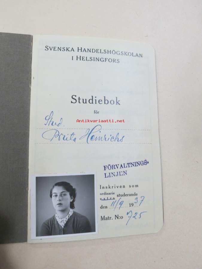 Svenska Handelshögskolani Helsingfors Studiebok för Studeranden Brita Heinrichs, matrikelnummer 725, 1937 -opintokirja
