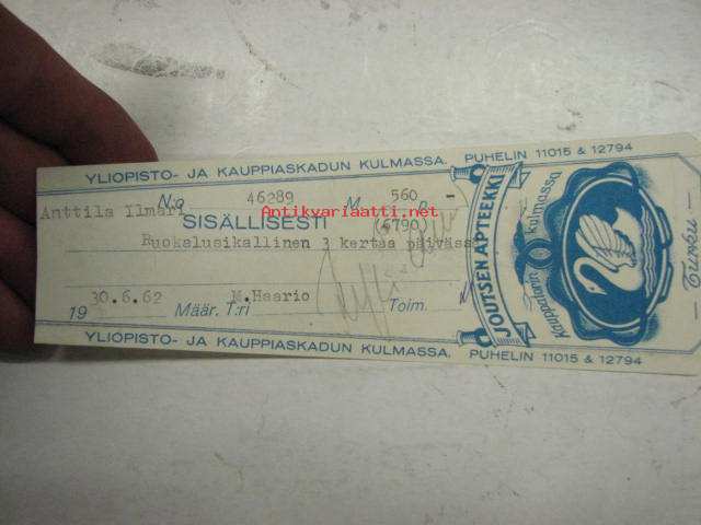 Joutsen Apteekki, Turku, 30.6.1962 -apteekkisignatuuri