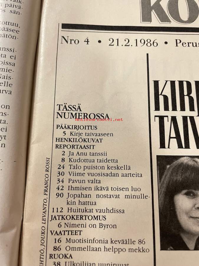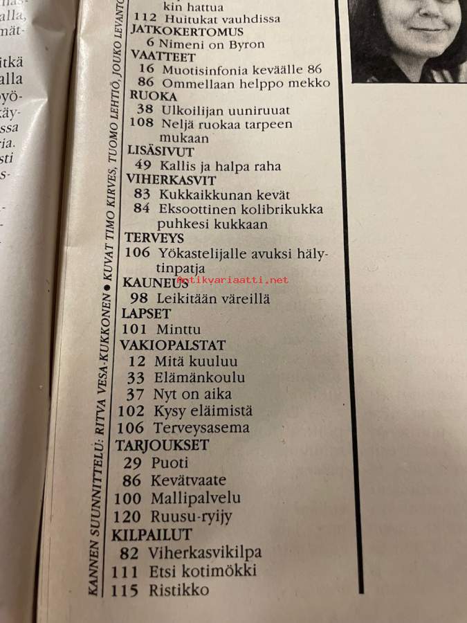 Kotiliesi 1986 nr 6, Lempivaatteet ja suosikkiasut, Kaija Huttunen - sydänkirurgi, harrastuksena vaaleanpunainen talo - Gitta ja Valto Kokko Jutikkalan kylä