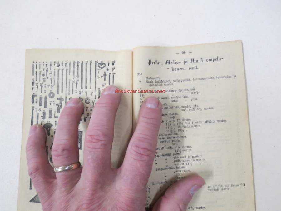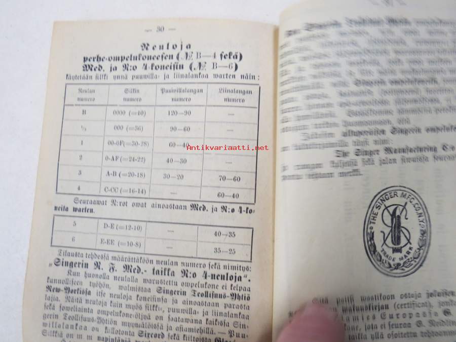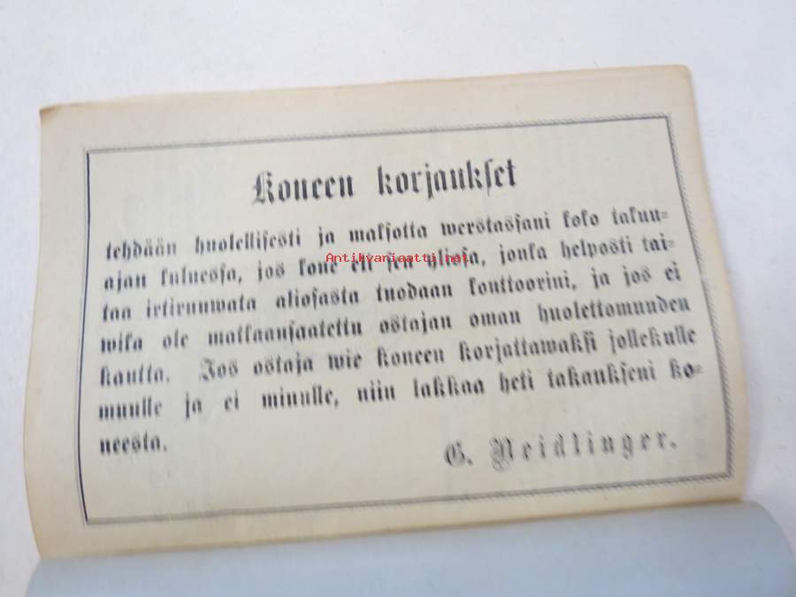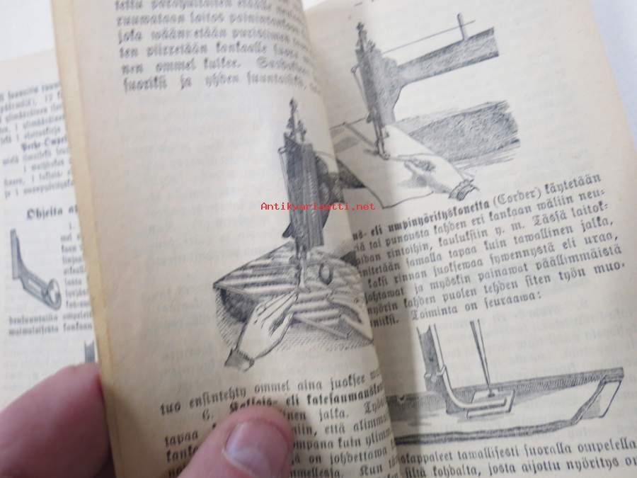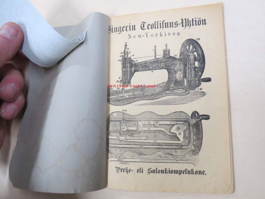 11 x 16 cm. Erittäin harvinainen Singerin käyttöohjekirja Suomessa myynnin alkuvuosilta, Suomen edustajan G. Heidlingerin kustantama.