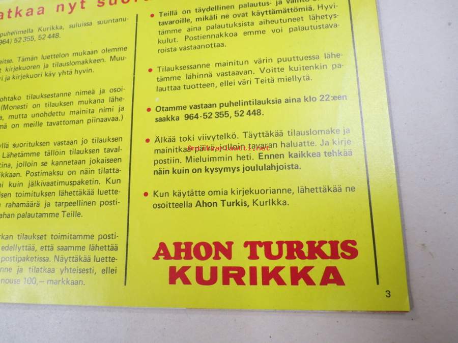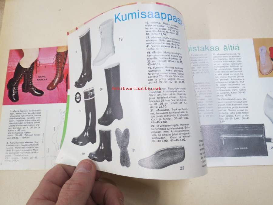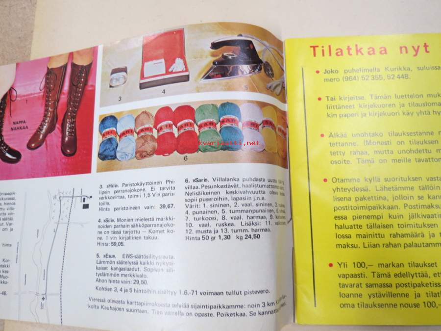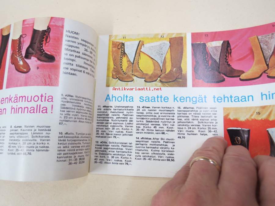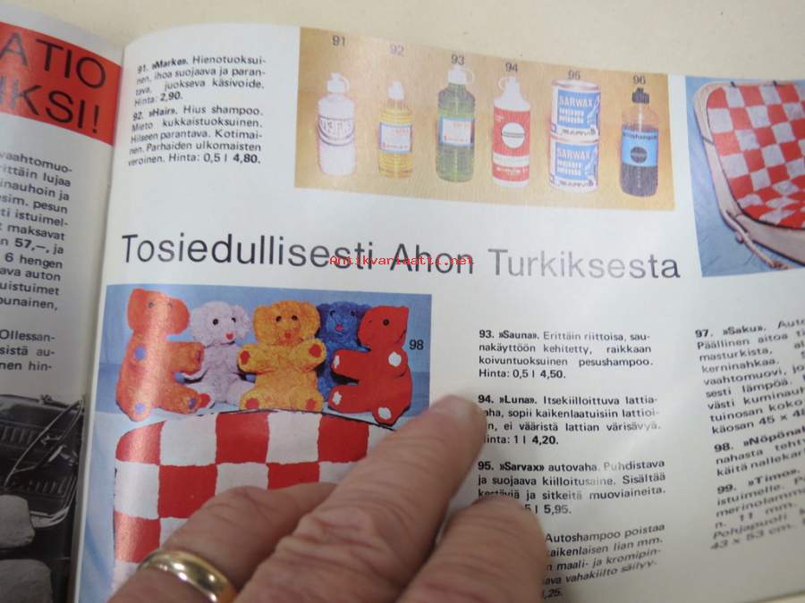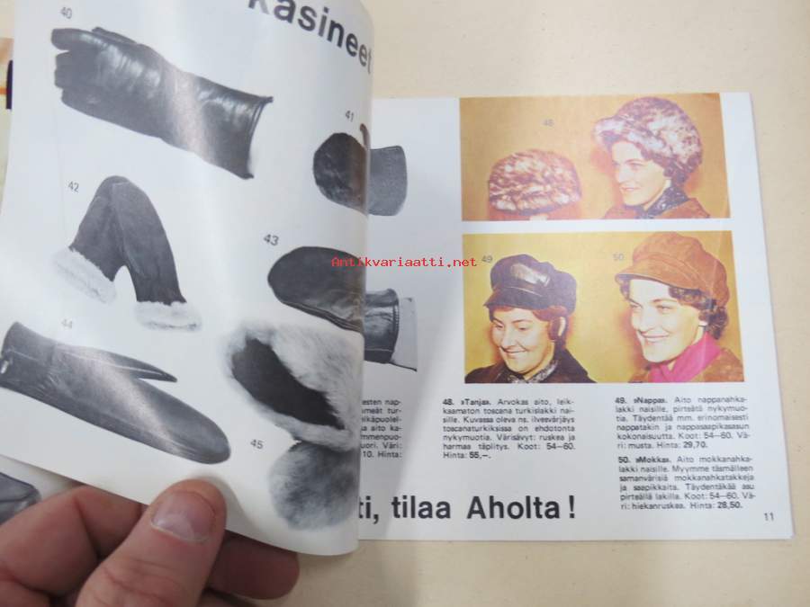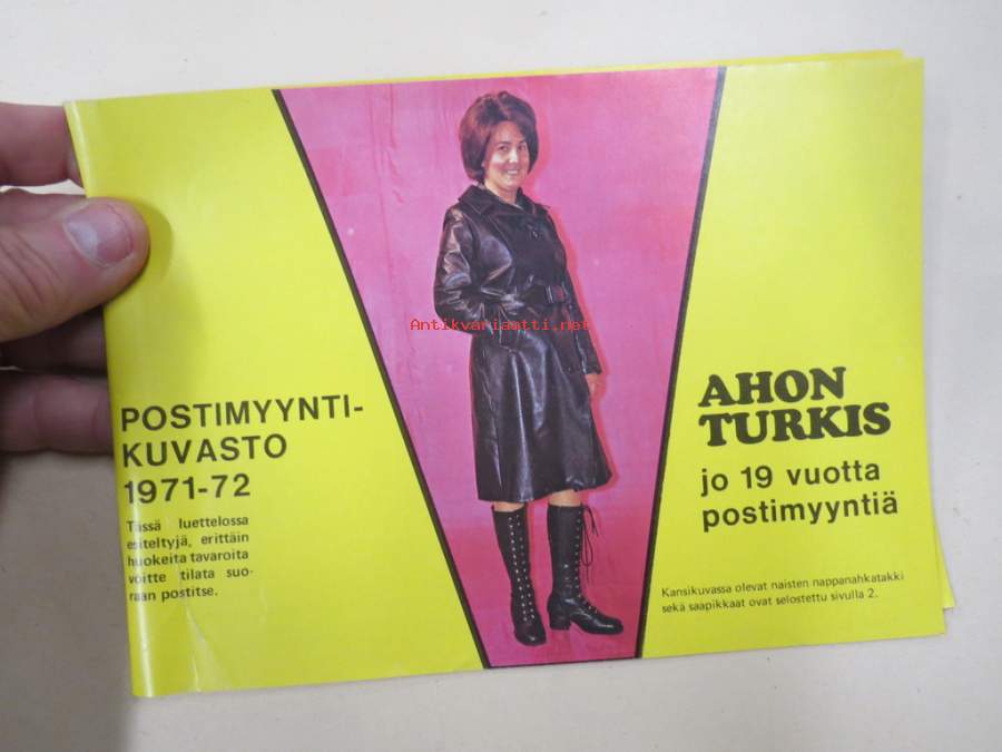Ahon Turkis, Mieto -postimyyntikuvasto 1971-72, takit, lakit, saappaat, hansikkaat, autovällyt, istuinsuojat, vaatteet, kodin kankaat, ym.