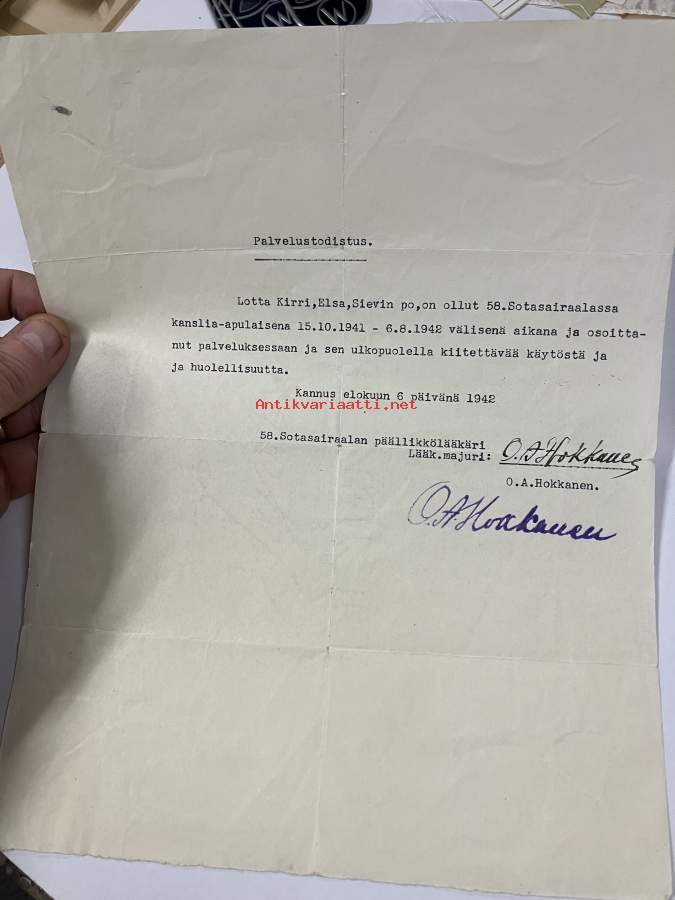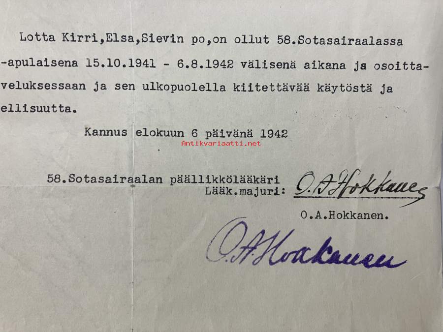Lotta Elsa Kirri, Sievin paikallisosasto, ollut 58. Sotasairaalassa kansliapaulaisena.. -palvelustodistus, allekirjoitus päällikkölääkäri Lääk. majuri O.A. Hokkanen