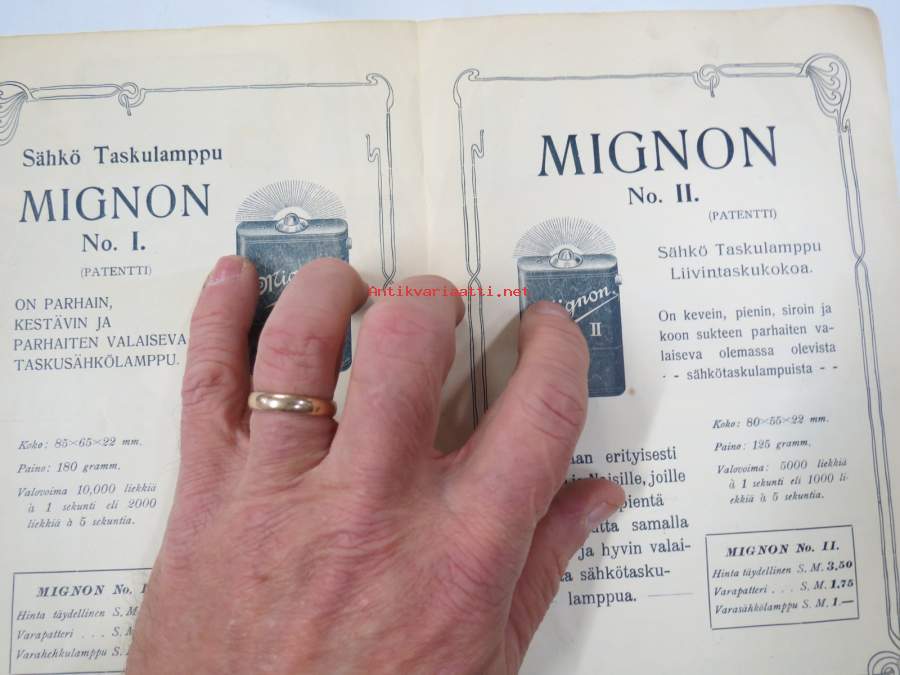Mignon I & II Taskusähkölamppu "suositellaan herroille Urheilioille, Sotilaille ja Virkamiehille" + Astrid, Sigrid & Ingrid sähkölamput -myyntiesite