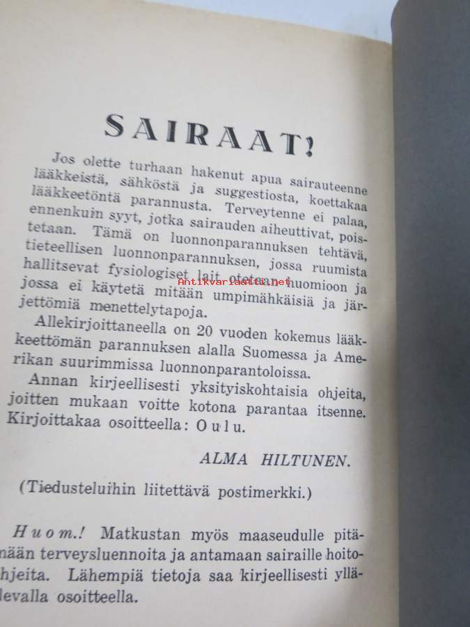 13 x 20 cm, tekijä on suorittanut lääkkeettömän lääkärin tutkinnon Bernard McFadden´inInternational College of Drugless Physicians Opistossa Chigagossa , Yhdysvalloissa.